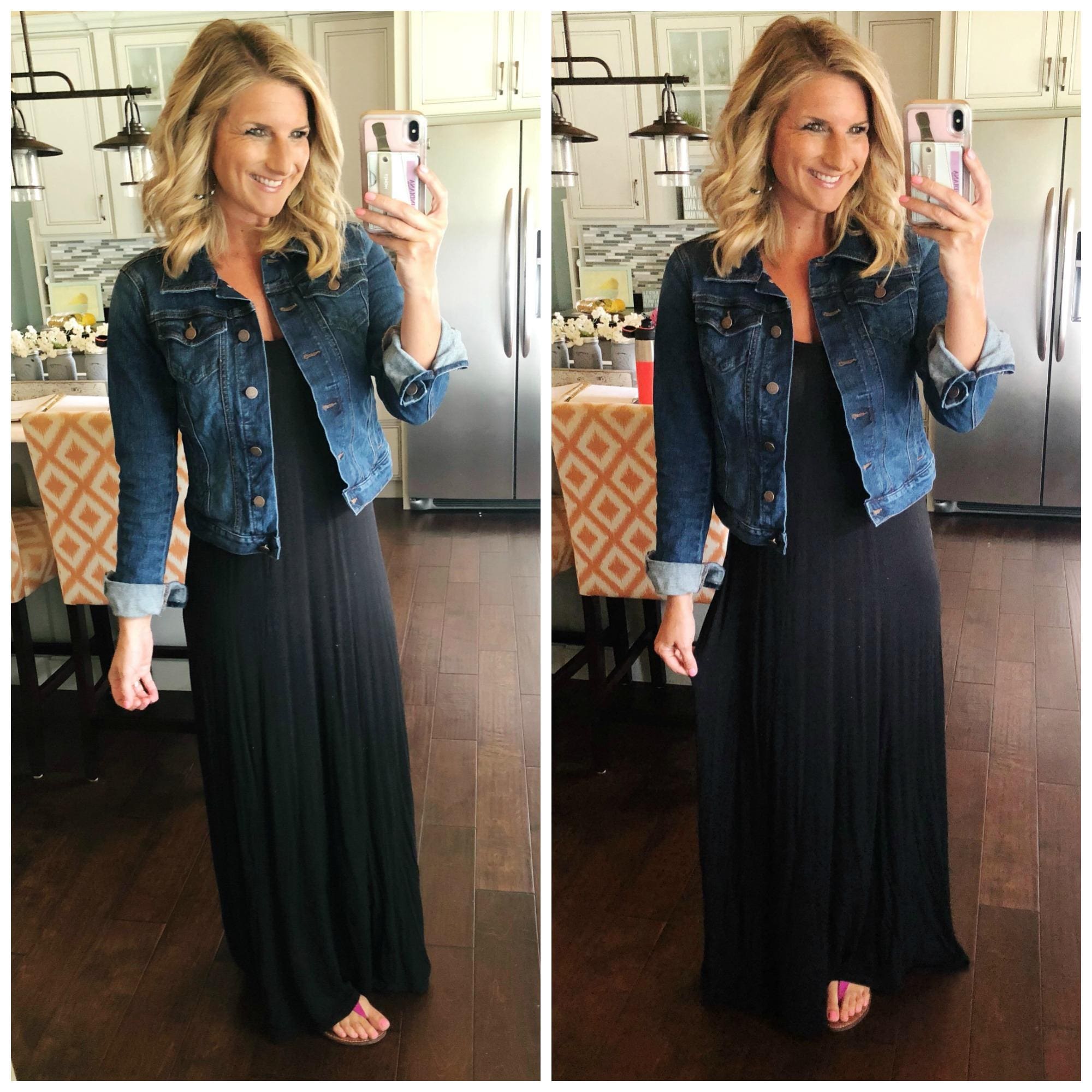LOVEAPPELLA Maxi Dress [TTS, wearing in size Small] // KUT from the Kloth Helena Denim Jacket [TTS, wearing in size small] // Sam Edelman Gigi Thong Sandal [size up .5] // Tortoiseshell Statement Earrings