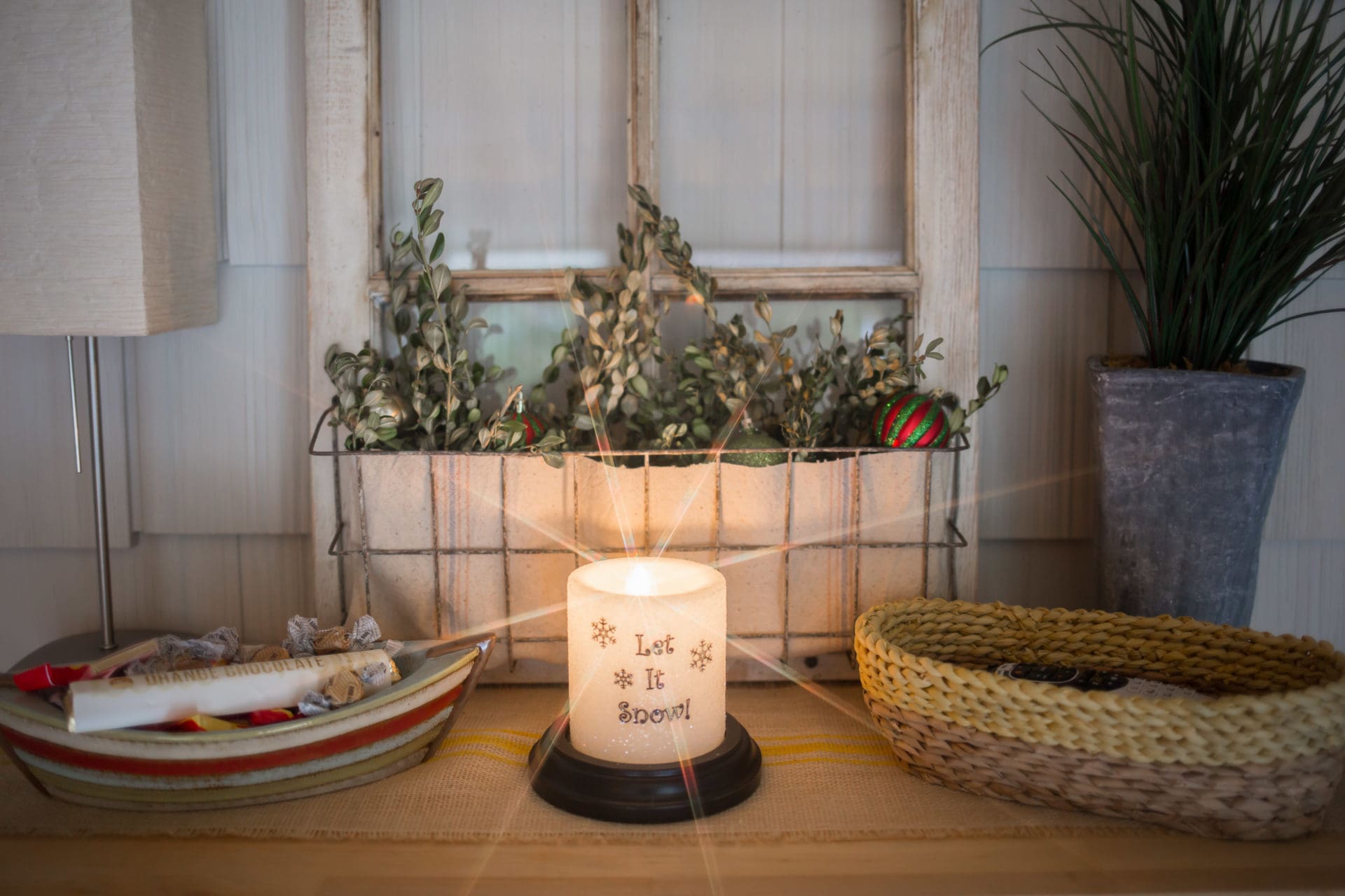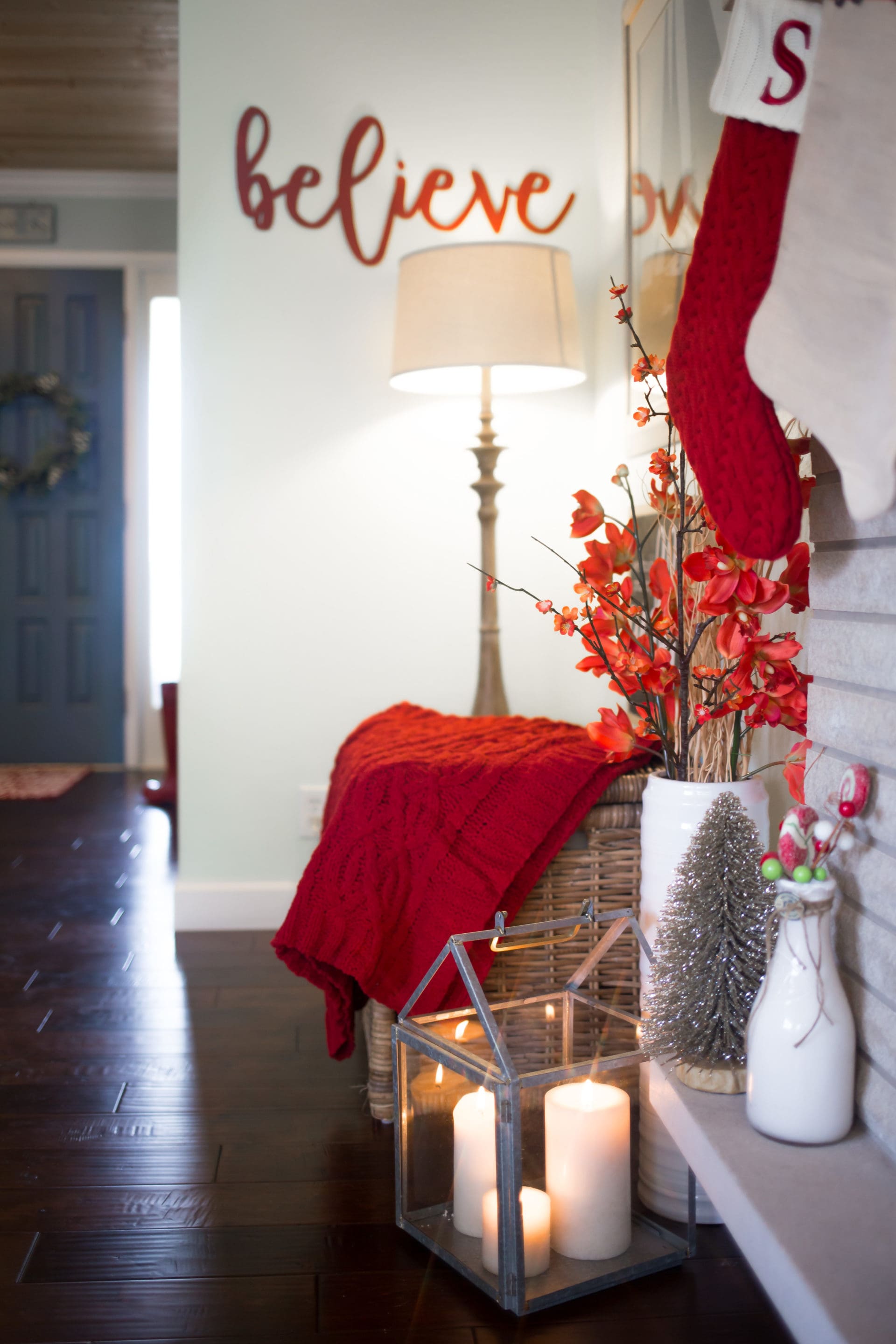 believe wood cutout // Hearth & Hand with Magnolia Galvanized House Lantern Medium // Hearth & Hand Sugared Birch Pillar Candles // Threshold Chunky Chenille Throw Blanket