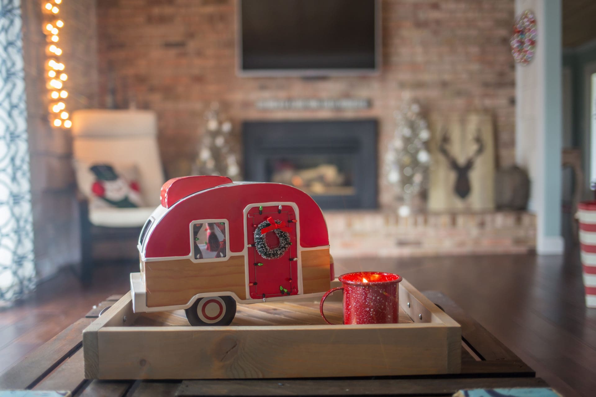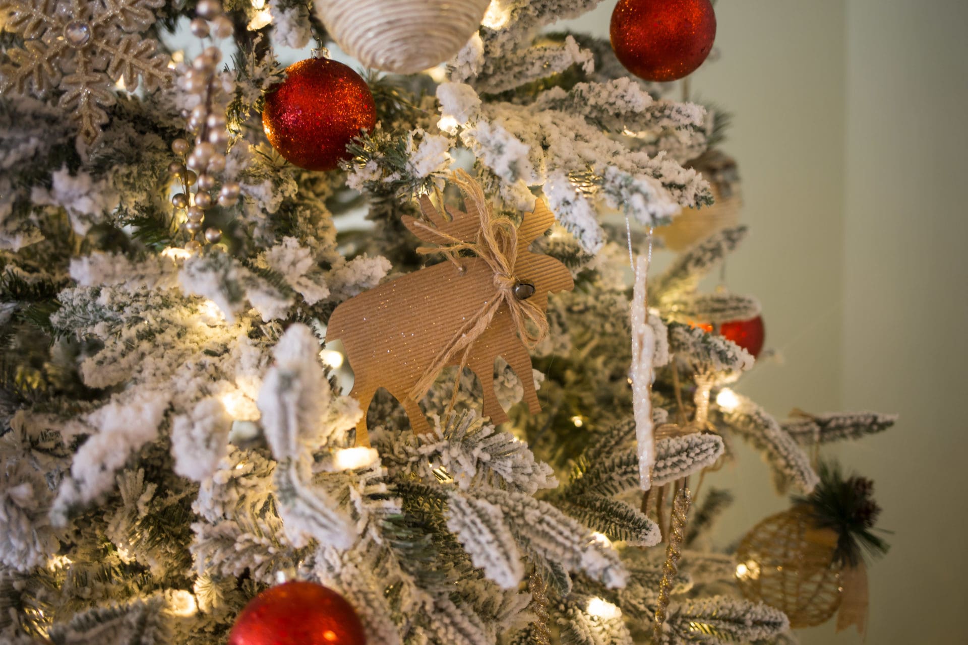 First official stop, the main living room, also known as my favorite room in the winter. It’s in here that you will find our main tree, fireplace and our main seating area. Last year we bought this flocked pre-lit tree, which I still can’t figure out if I think it looks like hairy fingers or is actually pretty. We’ll go with pretty for the purposes of today’s tour. I kinda love the addition of red and gold ornaments with little touches of natural elements in all things elks and reindeer.