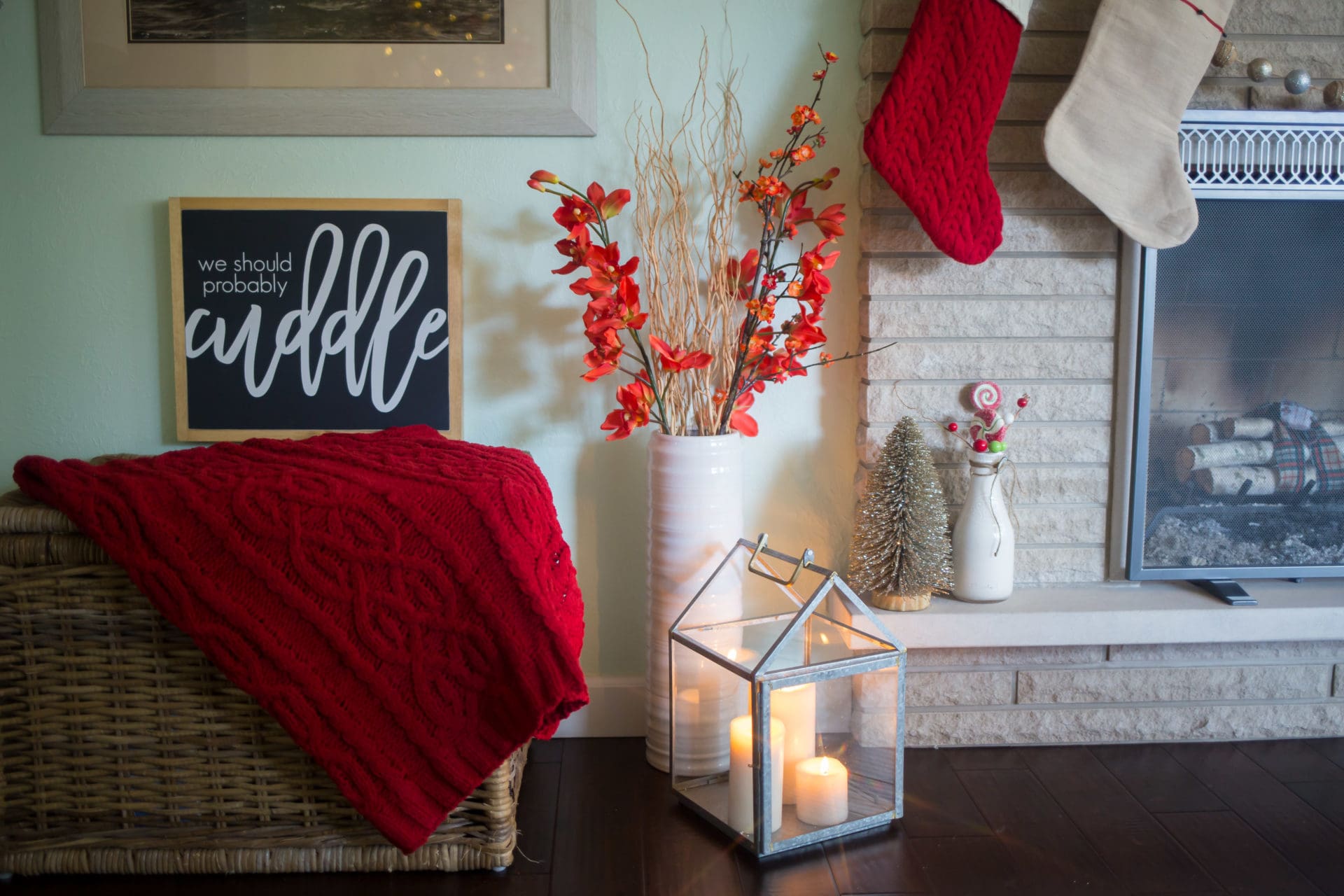 We should probably cuddle sign // Hearth & Hand with Magnolia Galvanized House Lantern Medium // Hearth & Hand Sugared Birch Pillar Candles // Threshold Chunky Chenille Throw Blanket