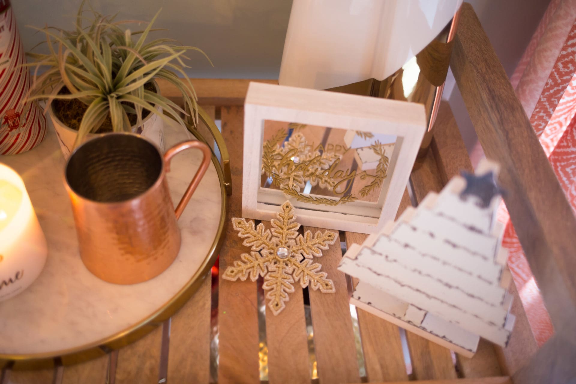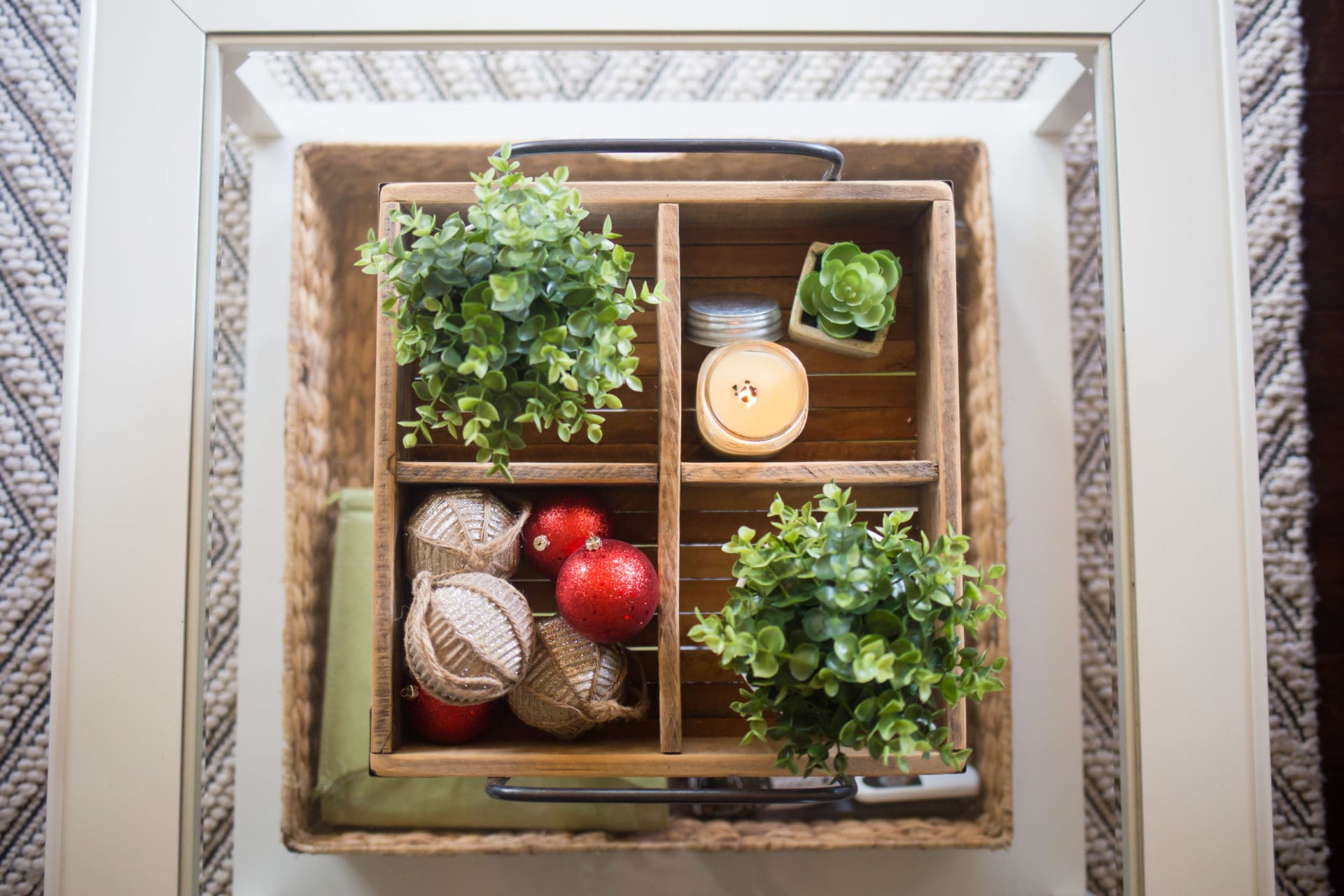 wood tray // faux plants from IKEA // ornaments from Hobby Lobby