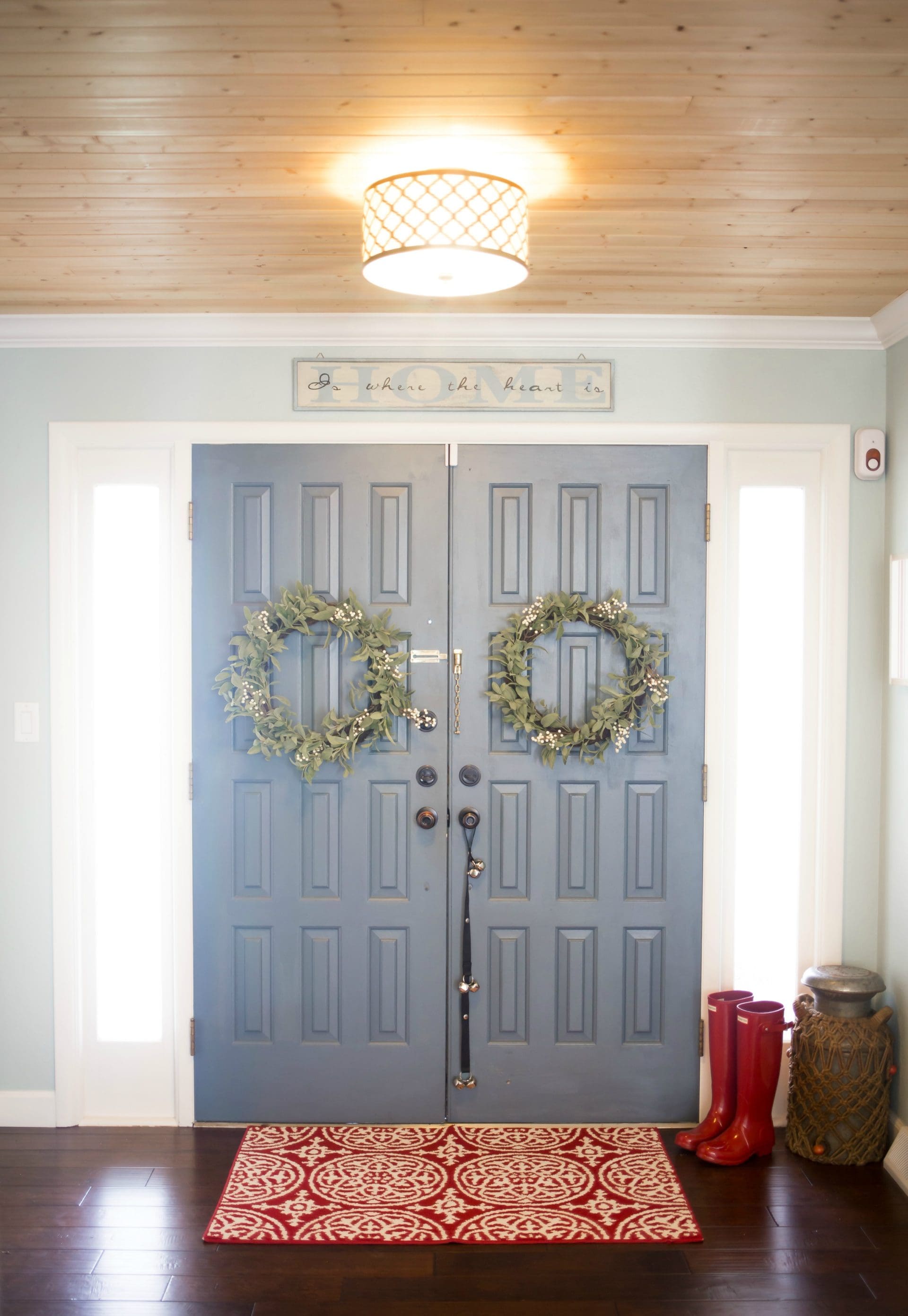 Hearth & Hand with Magnolia Artificial Lamb Ear and White Berry Wreath (24″) // Threshold Red Medallion Kitchen Rug // Hunter boots