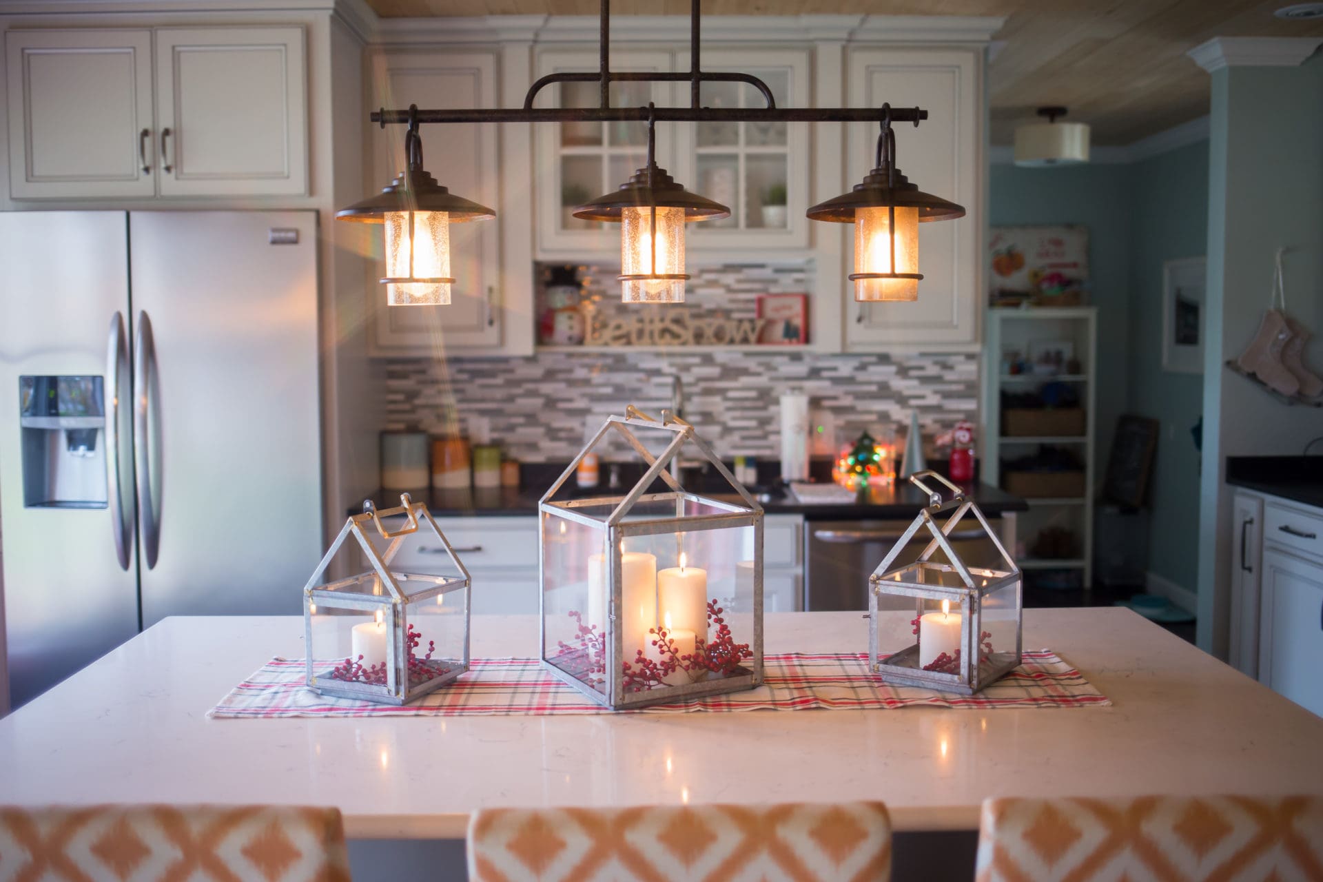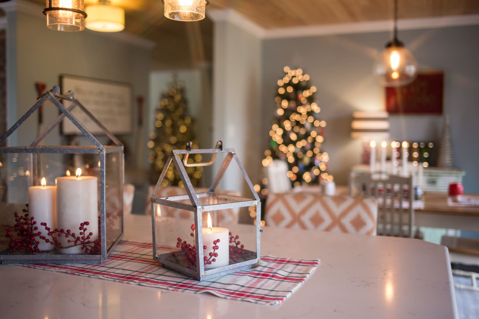 Hearth & Hand with Magnolia Galvanized House Lantern Medium // Hearth & Hand with Magnolia Galvanized House Lantern Small // Hearth & Hand Sugared Birch Pillar Candles // Holly Garland // Runner from dollar spot – Target