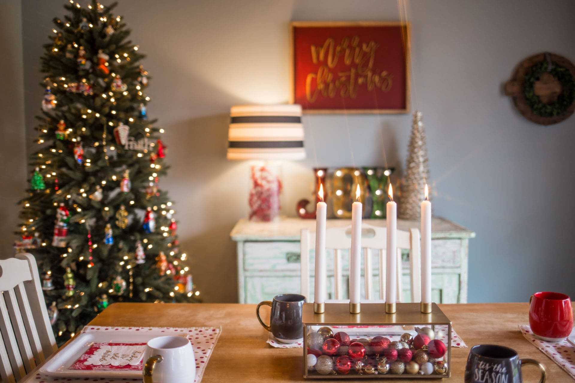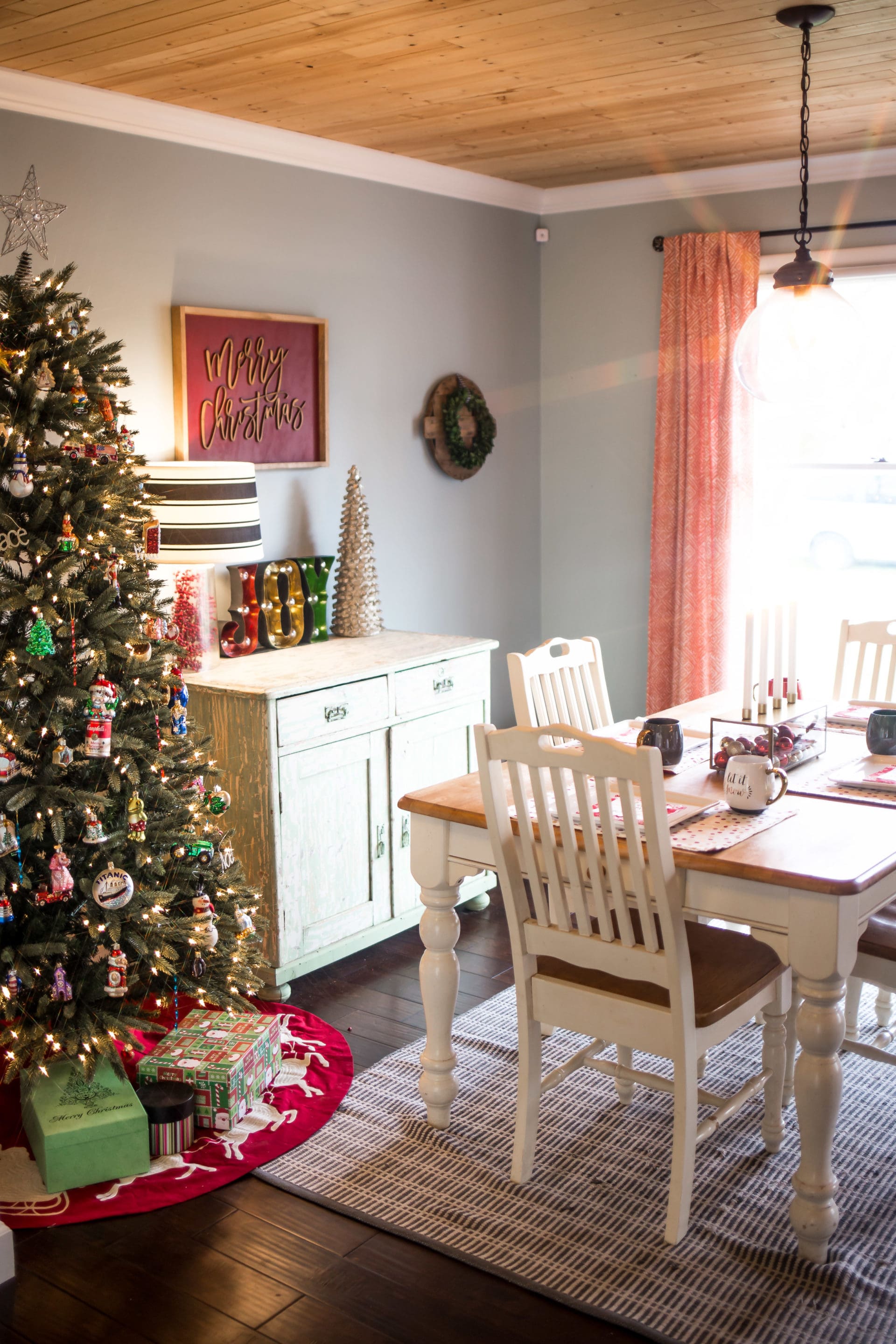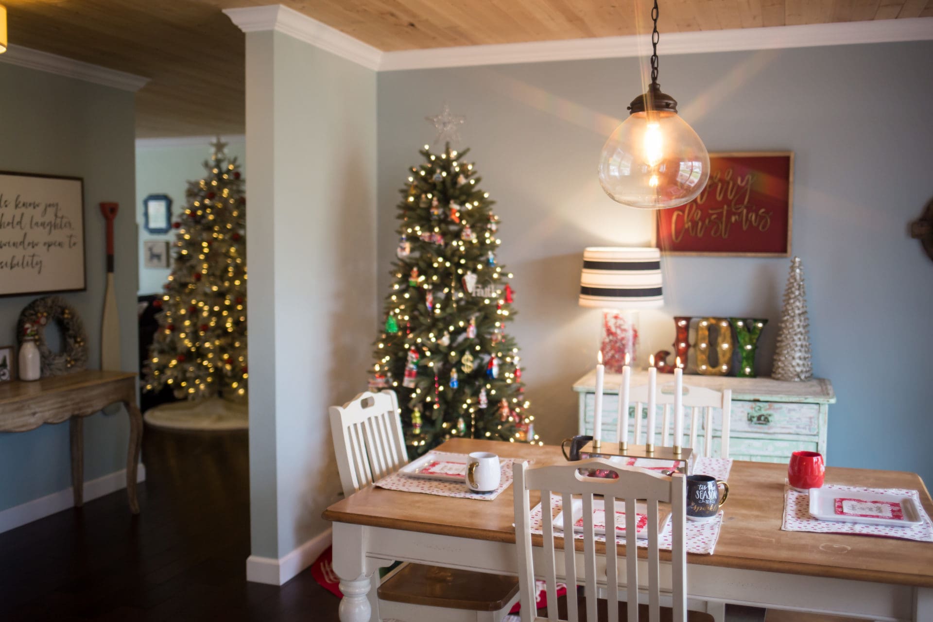 Off to the land of where allllllll of the goodness goes down, the kitchen and dining room of course. I love that we have a spot in our dining area to house another smaller tree. It is on this tree that we put all of the Old World Ornaments that we have been given over the years [perks of having an aunt who owns an ornament shop!] It is always my favorite putting the ornaments on this tree remembering why we got each ornament for each year as they are always themed to that year’s events. I am dying to get my hands on this one asap. I also especially love this space because when standing in the kitchen you have a view of both trees and it is the most little glorious sight to my eyes.
