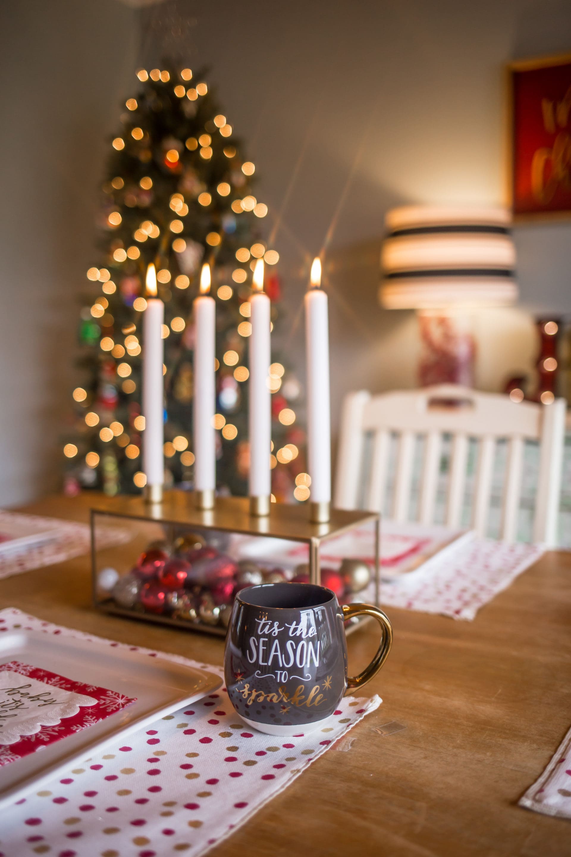 Threshold Stoneware Tis The Season To Sparkle Mug // Glass & Metal Candle Holder // Hearth & Hand with Magnolia Unscented Taper Candle (2pk)