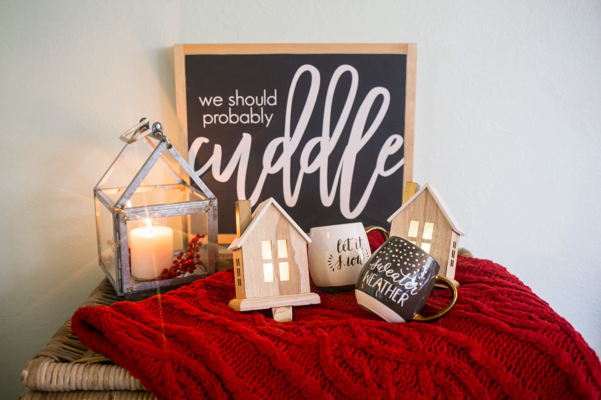 Hearth & Hand with Magnolia Galvanized House Lantern Small // Hearth & Hand Sugared Birch Pillar Candles // We should probably cuddle sign // Threshold Chunky Chenille Throw Blanket // Light Up House Stocking Wood // Let it snow mug & sweater weather mug