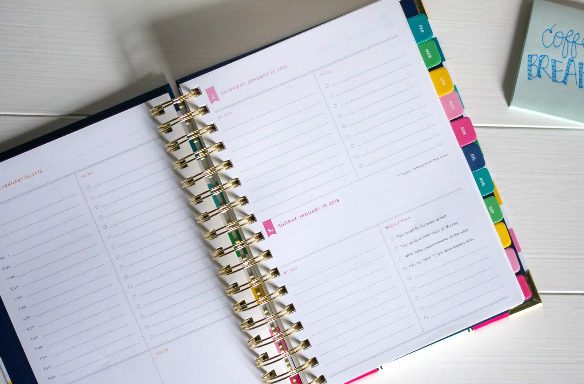 - Every month is tabbed a different color and there is a monthly overview at the start of every month. There is also a page every month to write down three goals, birthdays, events and things to remember. For the daily pages, the entire week is on a two-day spread. There is an hourly list from 7 am – 9 pm and a to-do list with 4 lines. At the very back there are two folder pages to hold papers and notes.