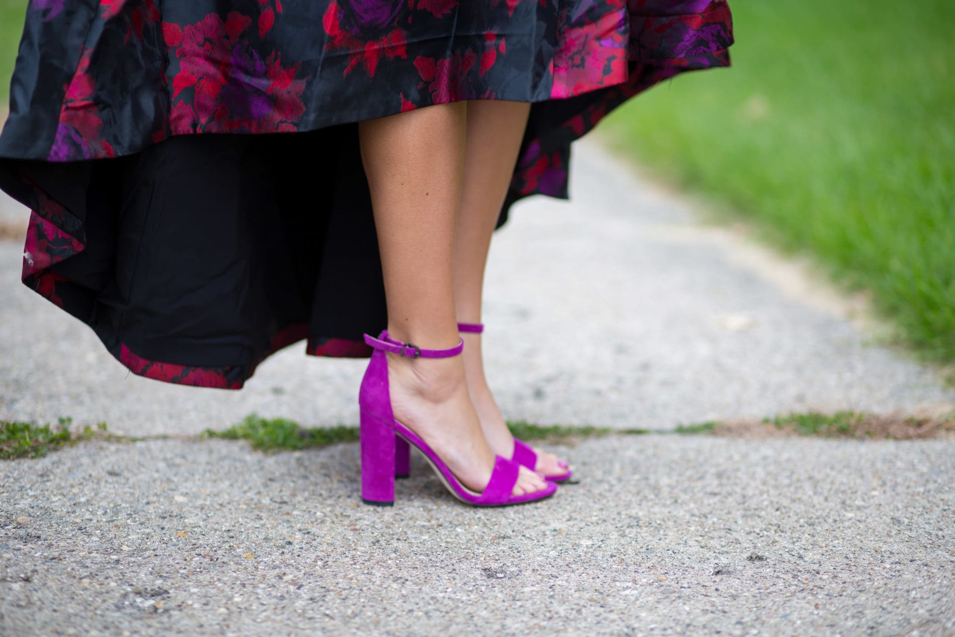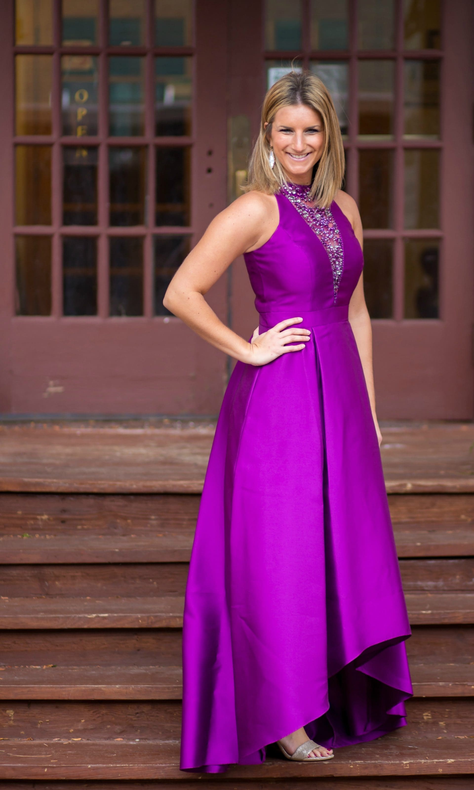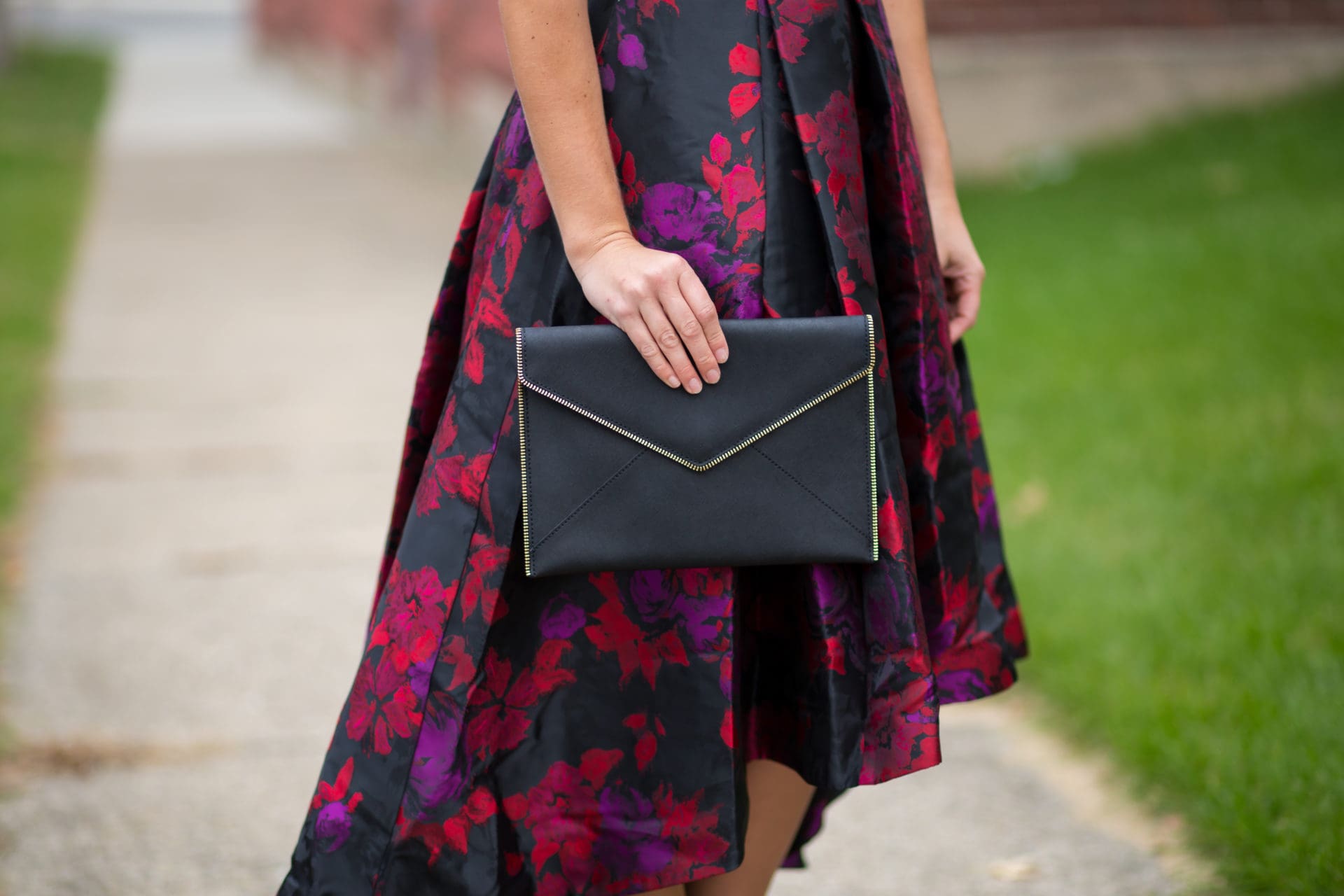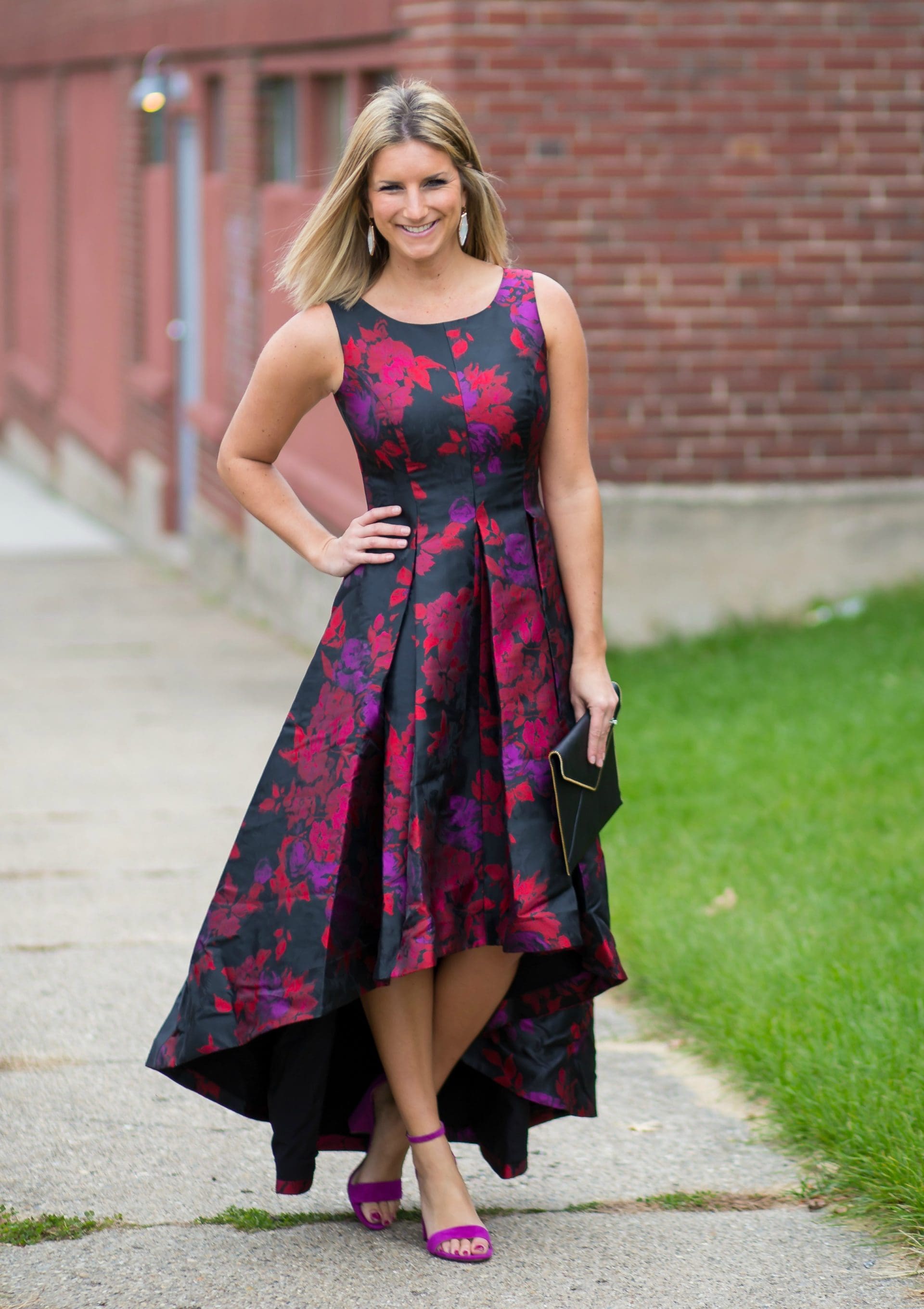 Eliza J Floral Jacquard High/low Gown [true to size, wearing in 2] // Sam Edelman Yaro Ankle Strap Sandal [true to size, wearing in laser purple suede] // Kendra Scott Drop Earrings // Rebecca Minkoff Leo Envelope Clutch