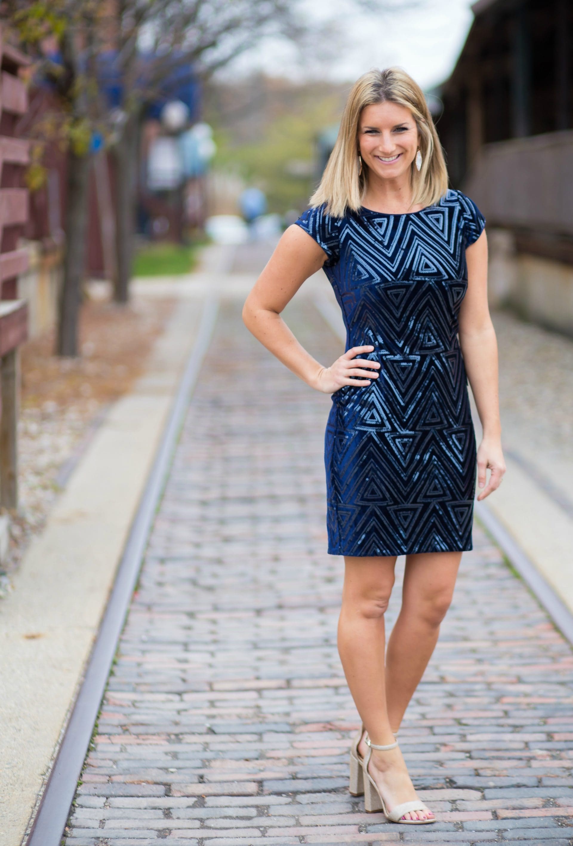 This is another fun and festive option for those parties this winter when you’re looking to make a statement without being too over the top. A little bit of sex appeal thanks to the form-fitting cut and a little shorter [yet not too short!] to show off those sexy legs. I love the navy and black together and the triangle detail to give it some edge! Perfect NYE option as well!