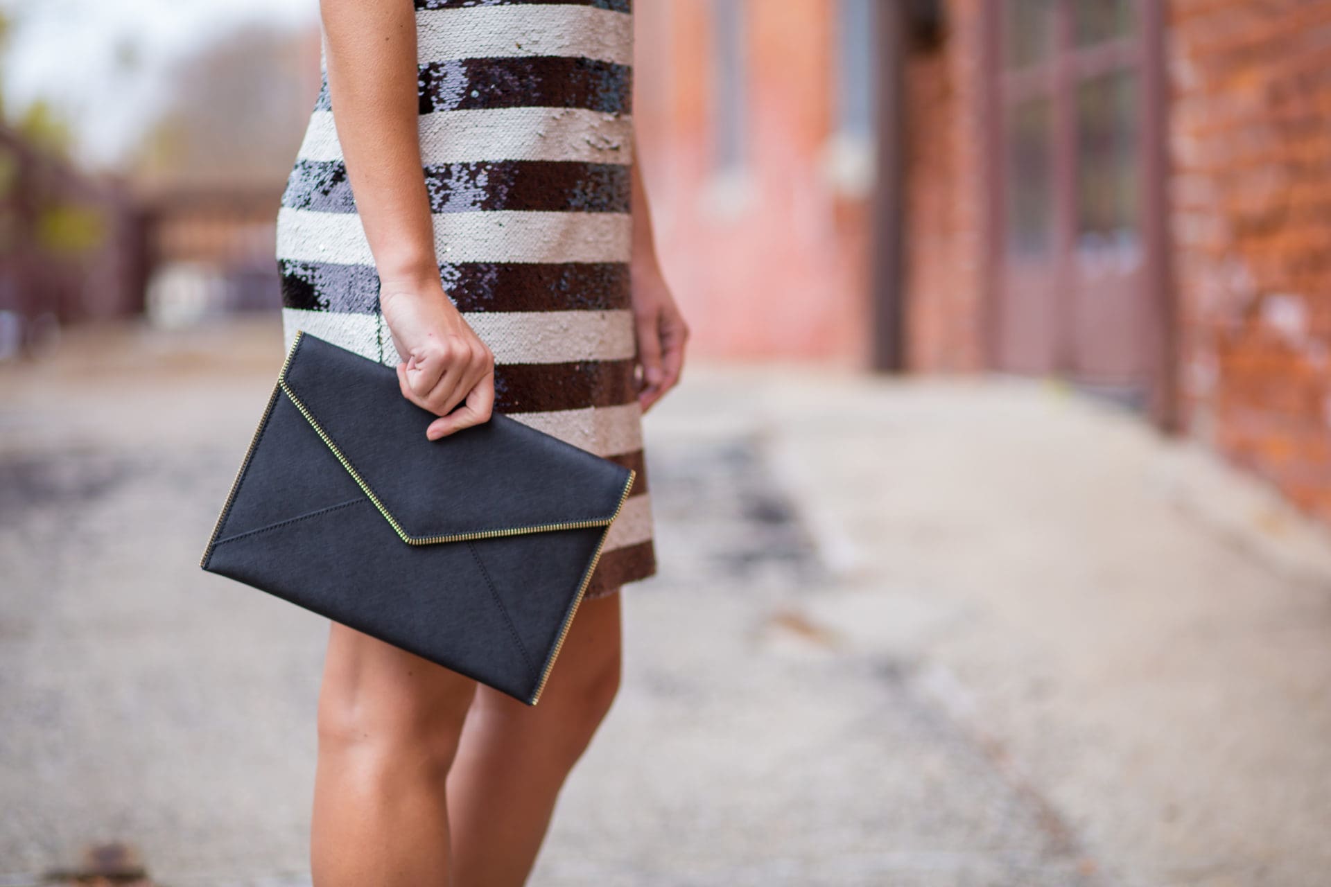 Eliza J Reversible Stripe Sequin Shift Dress [true to size, wearing in 2] // Jeffrey Campbell ‘Lindsay’ Ankle Strap Sandal [size up!] // Rebecca Minkoff Leo Envelope Clutch // Kendra Scott Drop Earrings