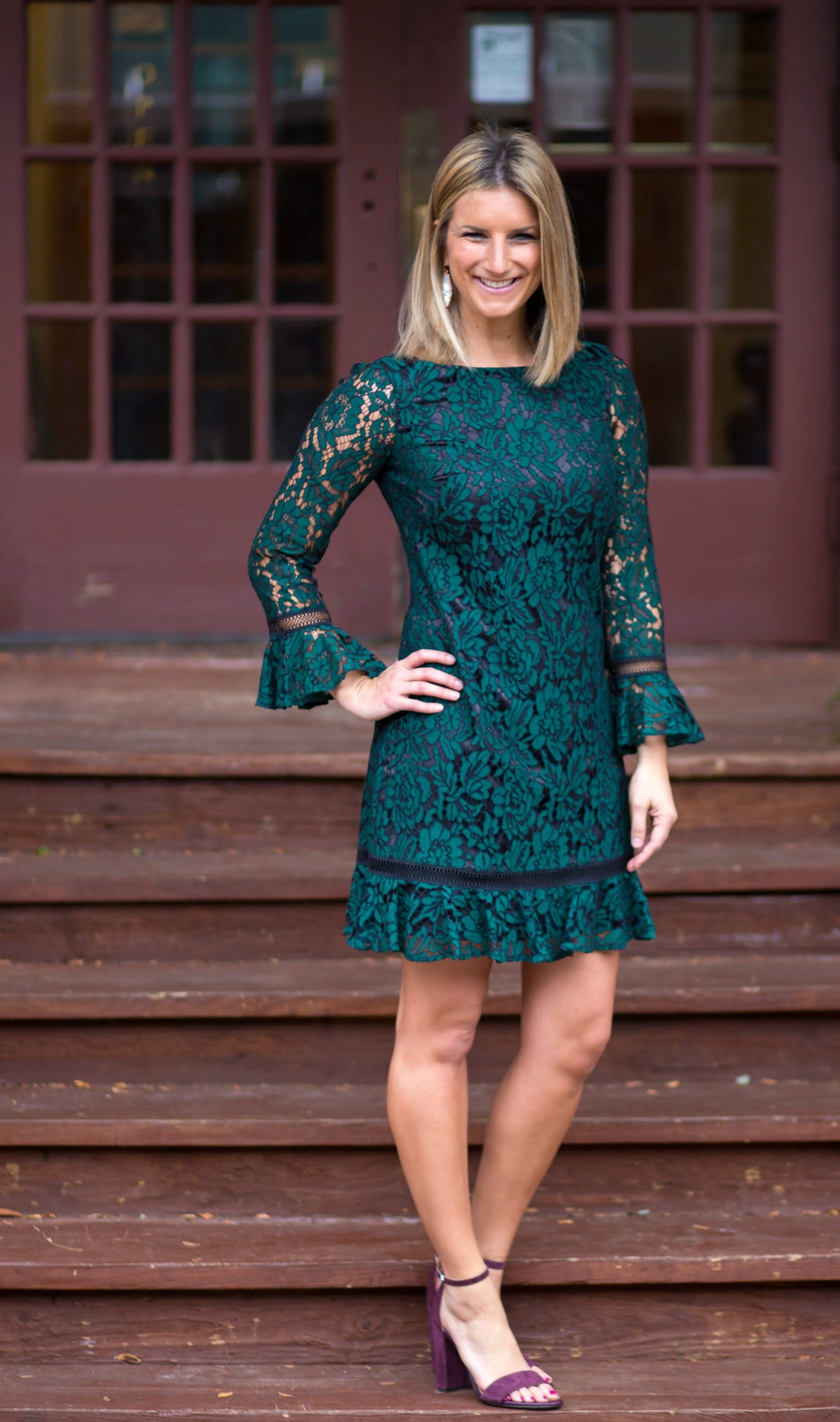 Eliza J Flare Sleeve Lace Shift Dress [true to size, wearing in 2] // Sam Edelman Yaro Ankle Strap Sandal [true to size, wearing in port wine suede] // Kendra Scott Drop Earrings