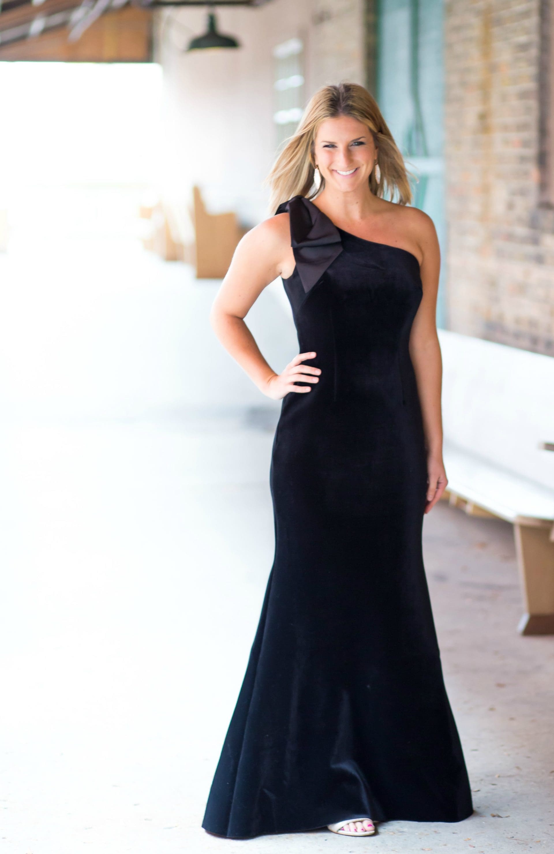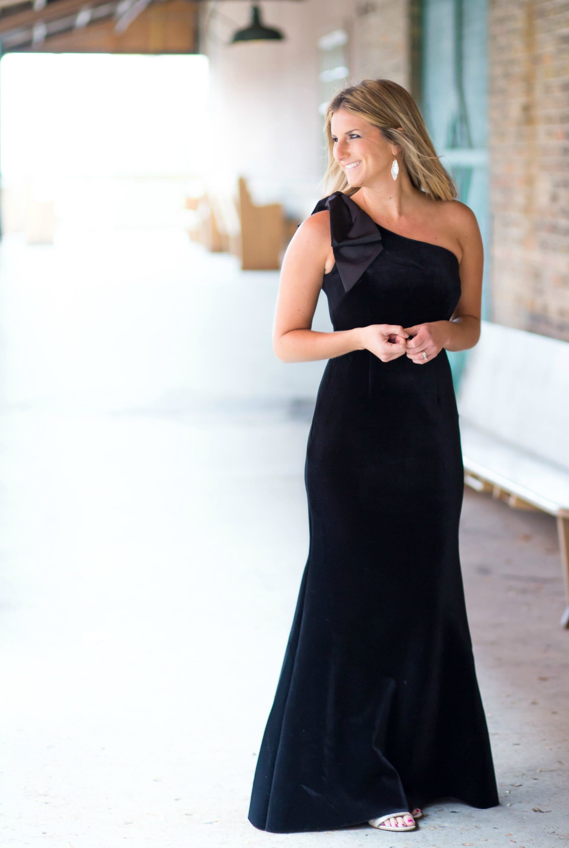 I think this is the PERFECT way to bring velvet into your wardrobe this winter. Sometimes velvet can be intimidating or tough to pull off, but this is the most elegant way I have ever seen it done. Add in the flattering shape, one shoulder bow detail and classic black color and this baby is timeless! I simply paired it with my favorite go-to heel and statement earrings and called it complete! You don’t need much when your dress says this much..
