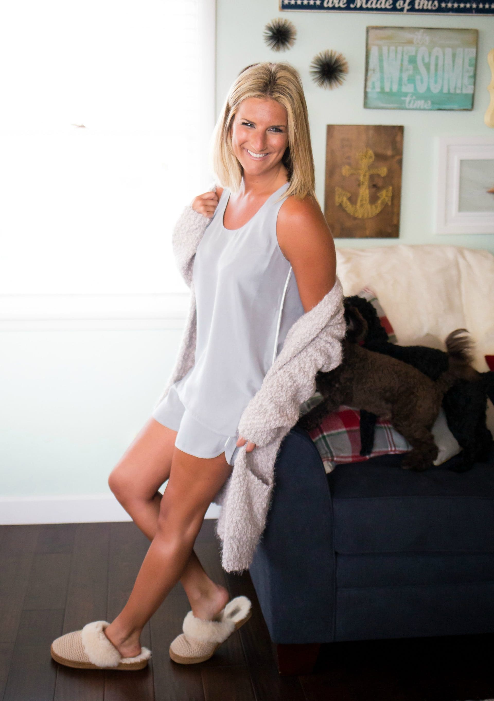 silk pajama set // cardigan // slippers