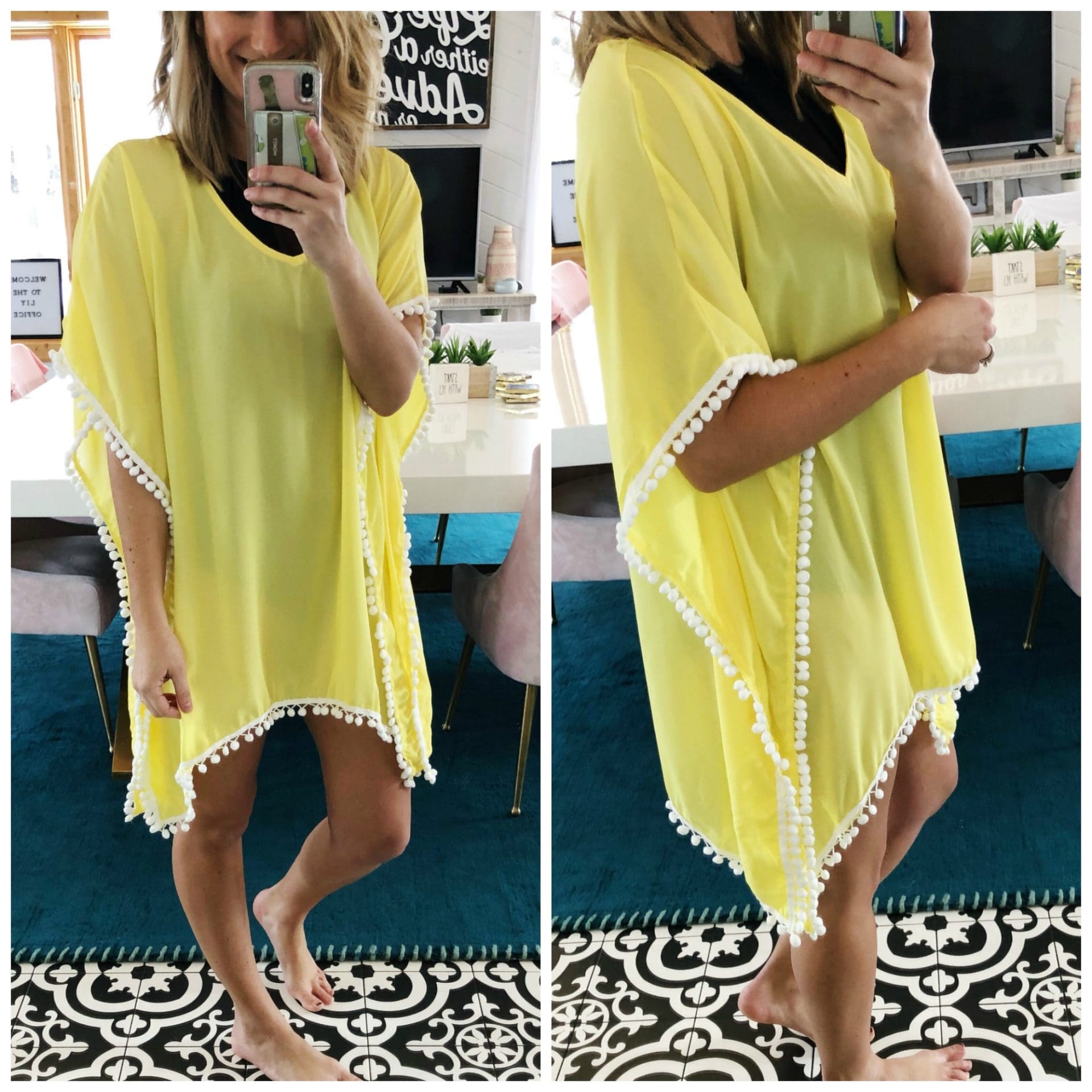 - Swimsuit coverup [one size fits all]: Adreamly Women’s Pom Pom Trim Kaftan Chiffon Swimwear Beach Cover Up