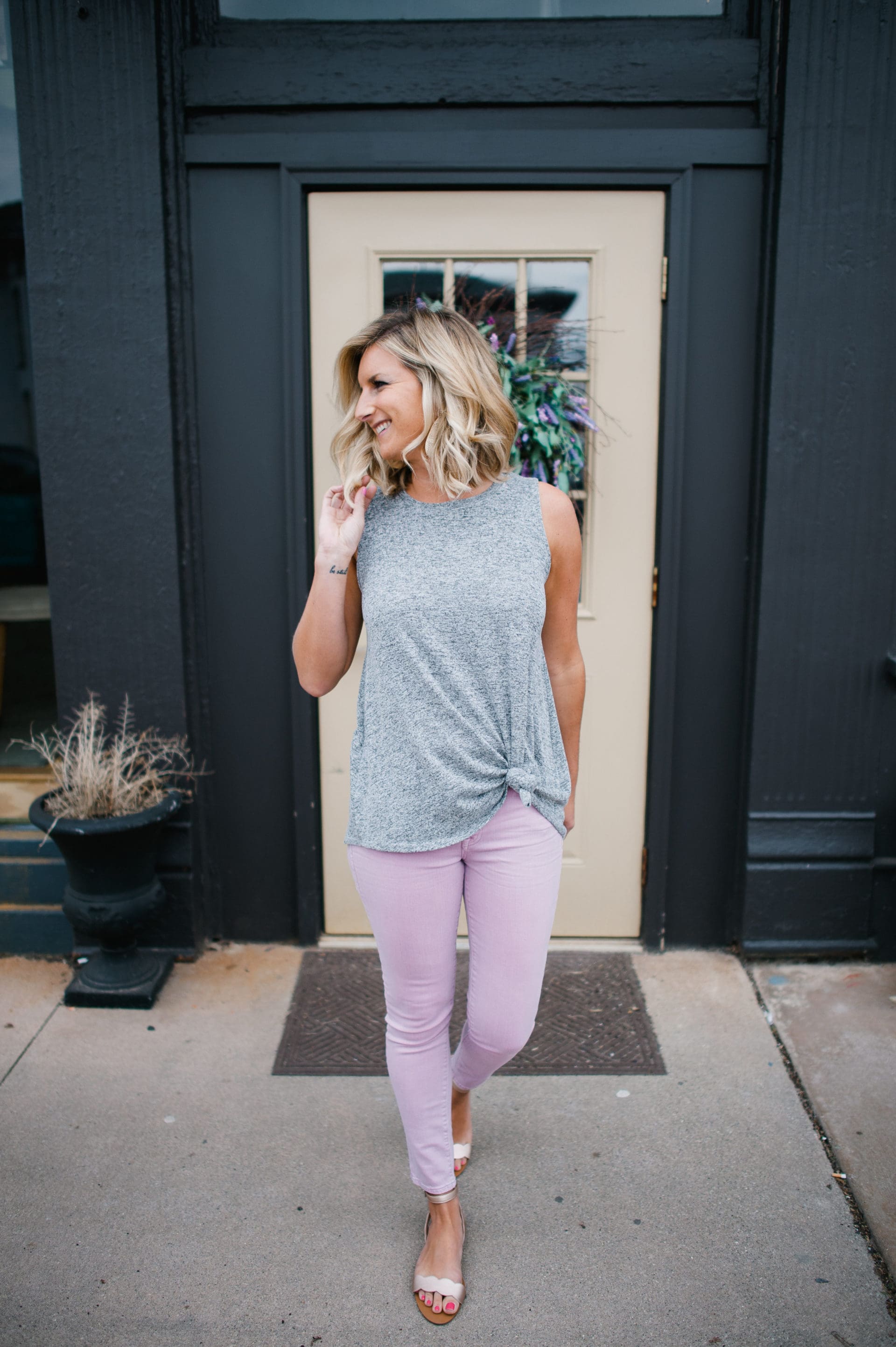 You have probably seen lavender, lilac or ultraviolet popping up everywhere these days. All things purple are the rage right now and I can’t say I’m mad about it. It is such a fresh color and makes for either a great statement piece or can easily be incorporated into your accessories! To try this trend, I went with a great pair of lavender pants [sounds like a fun nickname] and to keep the outfit tamed down, paired it with a basic gray tank and some cute little sandals.