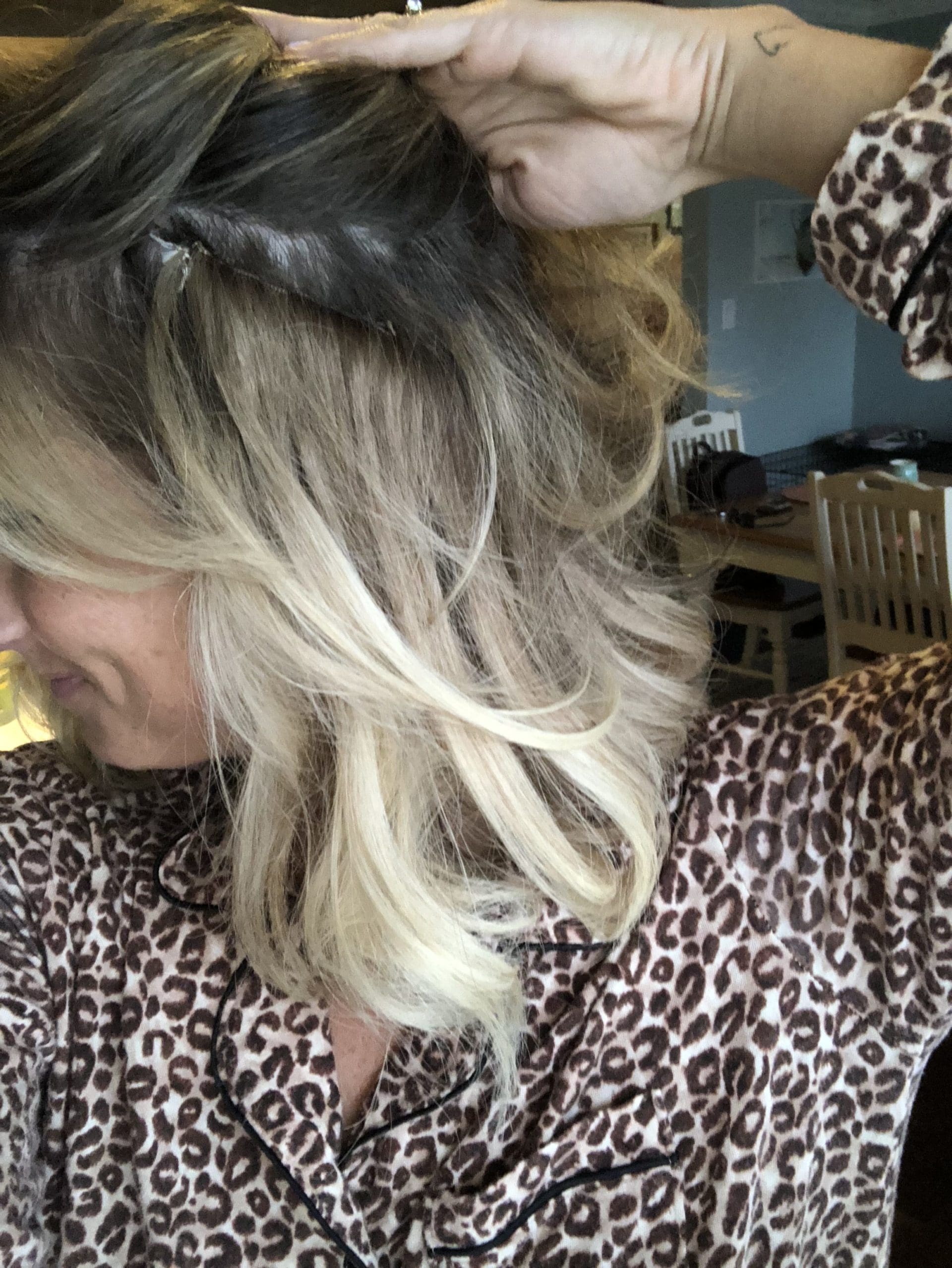 - There is no worry about the extensions slipping or falling out. The extensions grow naturally with your hair which you will see here. I just took these photos tonight and my last install was a month or so ago so you will notice they aren’t right up to my scalp like they first would be but again, you don’t even notice them in your hair after you’ve worn them awhile. In another few weeks, I will go in to have them moved up.