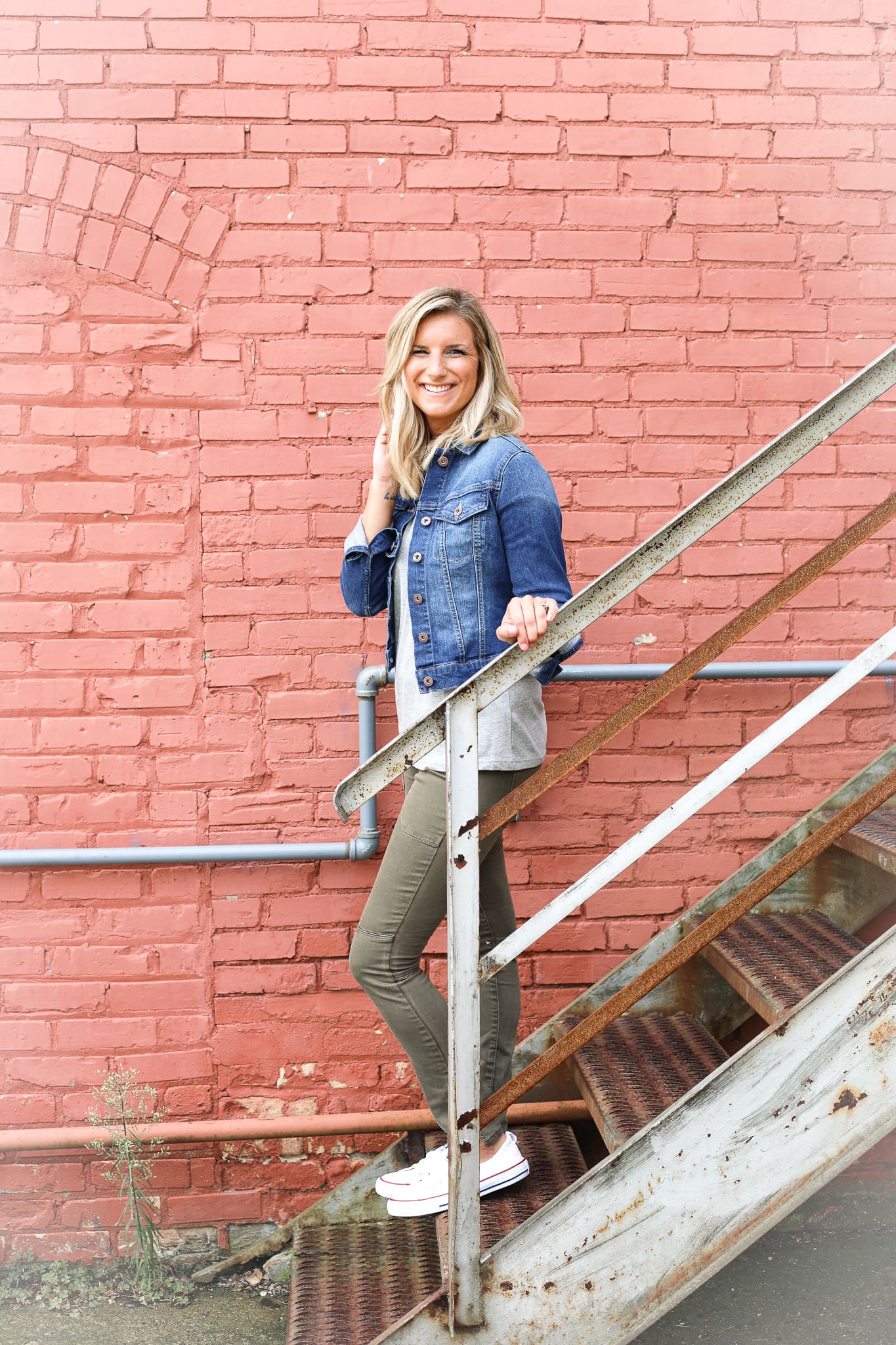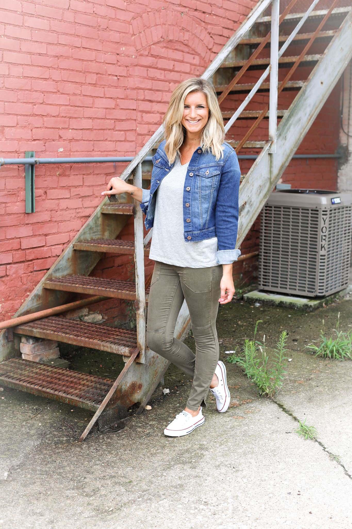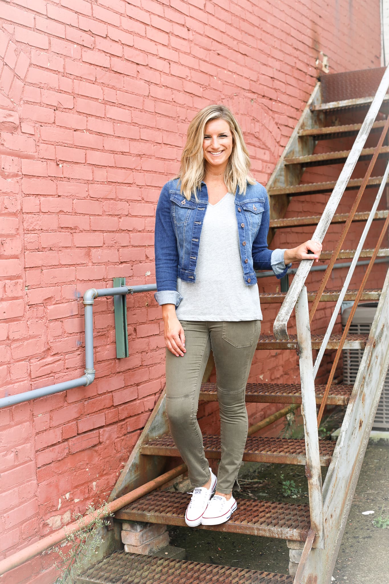 Finally, I’m keeping it casual. This is the perfect get-up for these August and September days where mornings and evenings can be in the 50s and 60s, but midday the temperatures still hit 80s! A denim jacket quickly adds that extra layer you need whether you’re on the soccer field sidelines or running to the store to start stocking up on all things fall decor. While you can definitely rock denim on denim [style is all about what makes YOU feel your best], I chose a colored denim pant! This olive color is perfect as we start adding more boots and booties into the usual sneaker into the rotation!