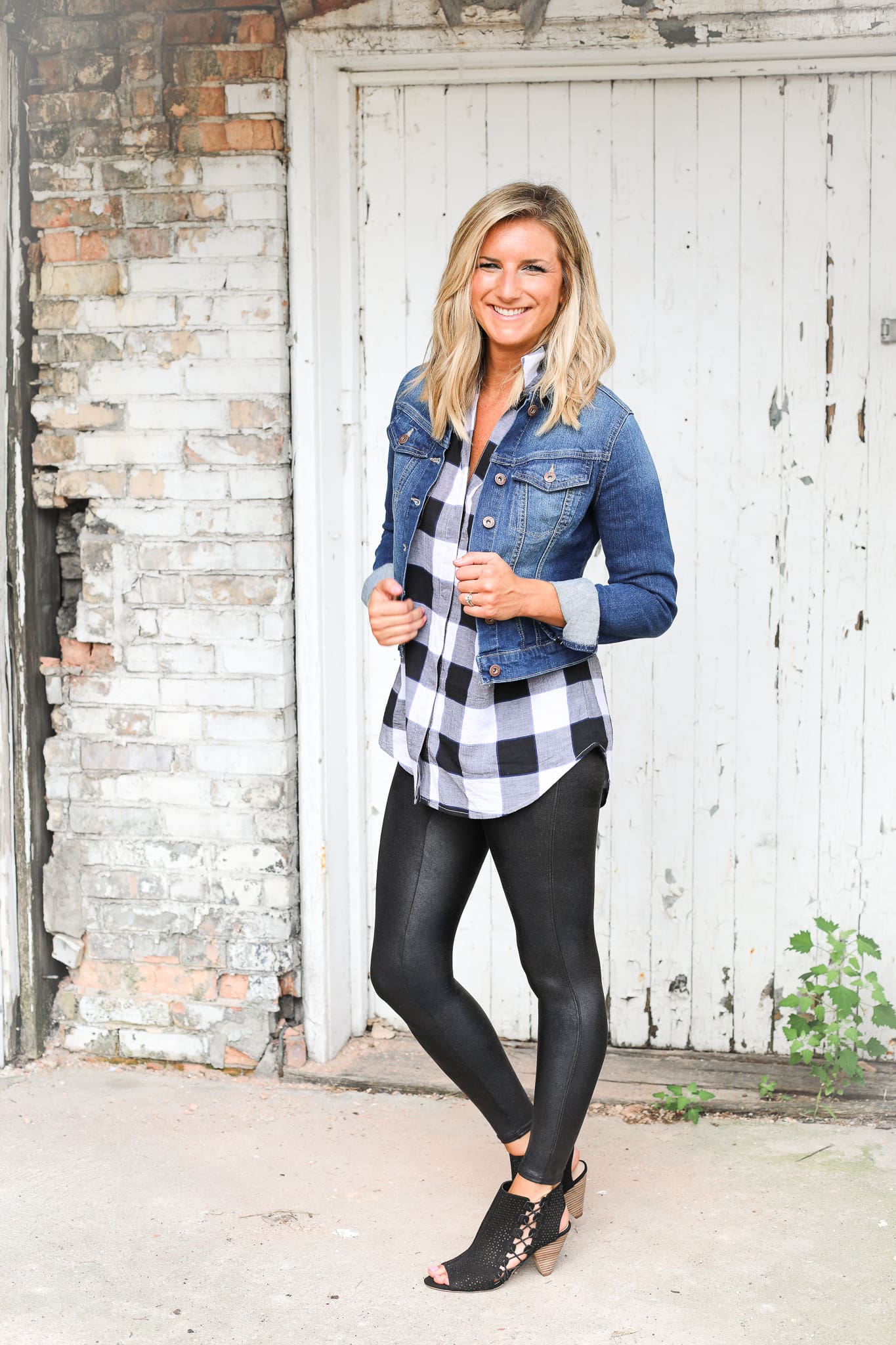Jessica Simpson Denim Jacket [TTS, wearing size Small] // Lord & Taylor Nancy Plaid Cotton Shirt [TTS, wearing size Small] // Spanx Faux Leather Shaping Leggings [Size up if in between, wearing in XS] // Vince Camuto Elison Lacer-Cut Suede Cone Heel Booties