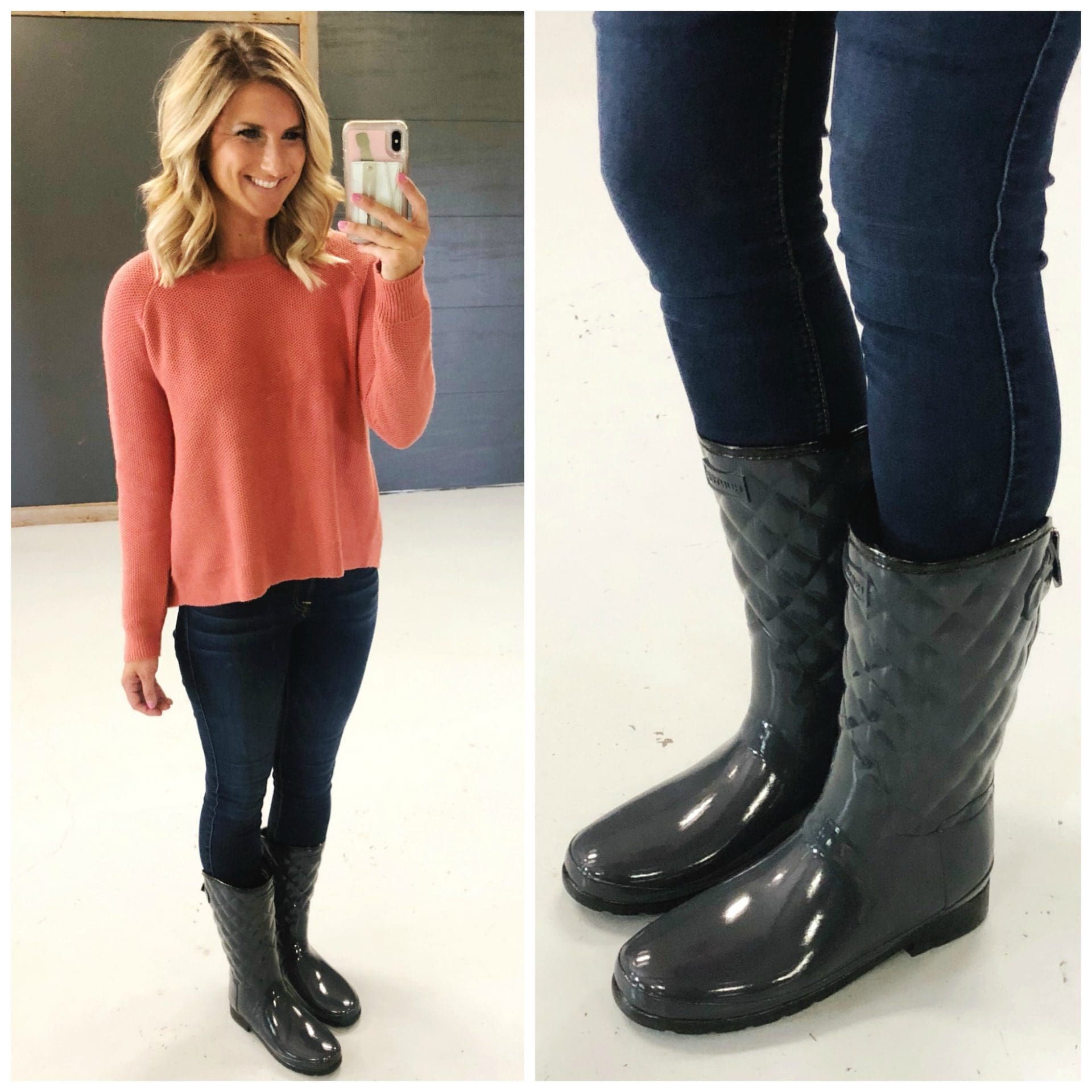 Hunter Refined High Gloss Quilted Short Rain Boot [size down for half sizes] I LOVE these! I’ve been on the hunt for shorter boots and these are perfect! The color is spot on and I love the quilted detail!