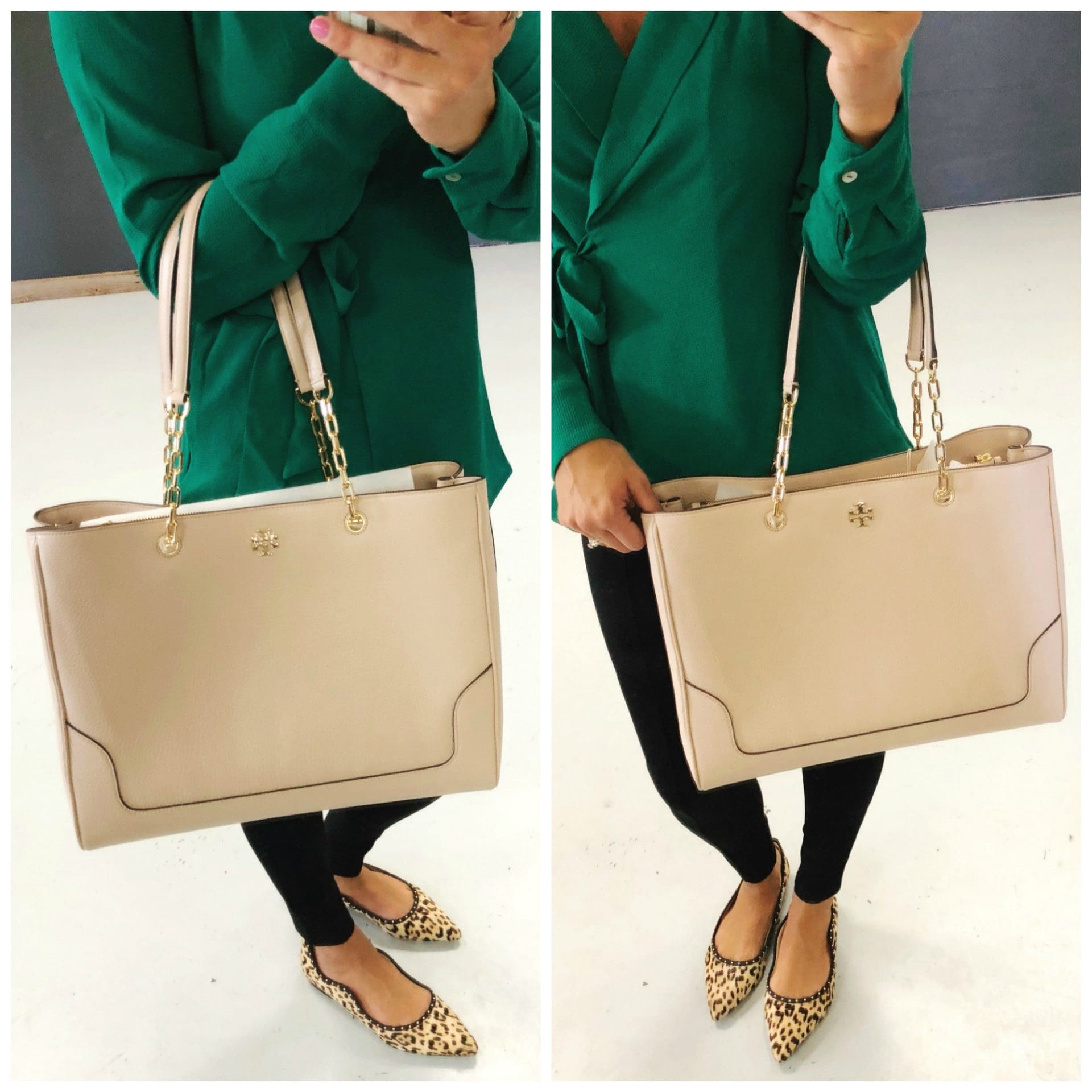 Tory Burch Marsden Pebbled Leather Tote This bag is a beauty. While it is a little spendy, I could see myself using it quite a bit as it does fit a laptop which is nice for days at the office and on the go. I love the blush color and gold chain detail, definitely a favorite from the sale!