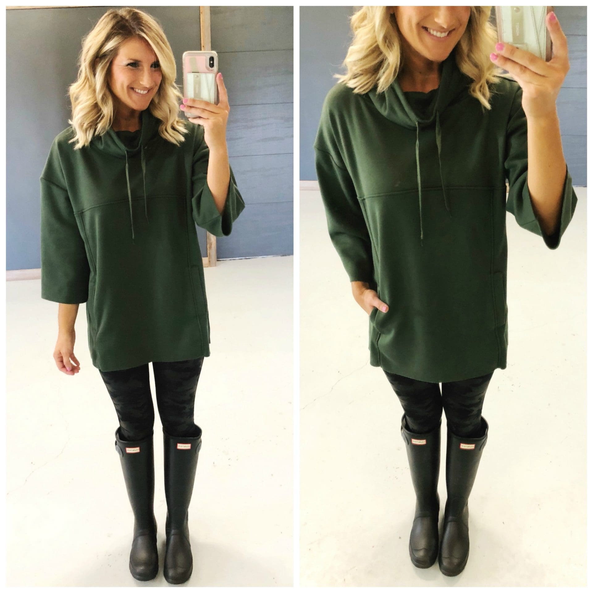 UGG(R) Astrid Poncho // SPANX(R) Camo Faux Leather Leggings //Hunter ‘Original Tall’ Rain Boot