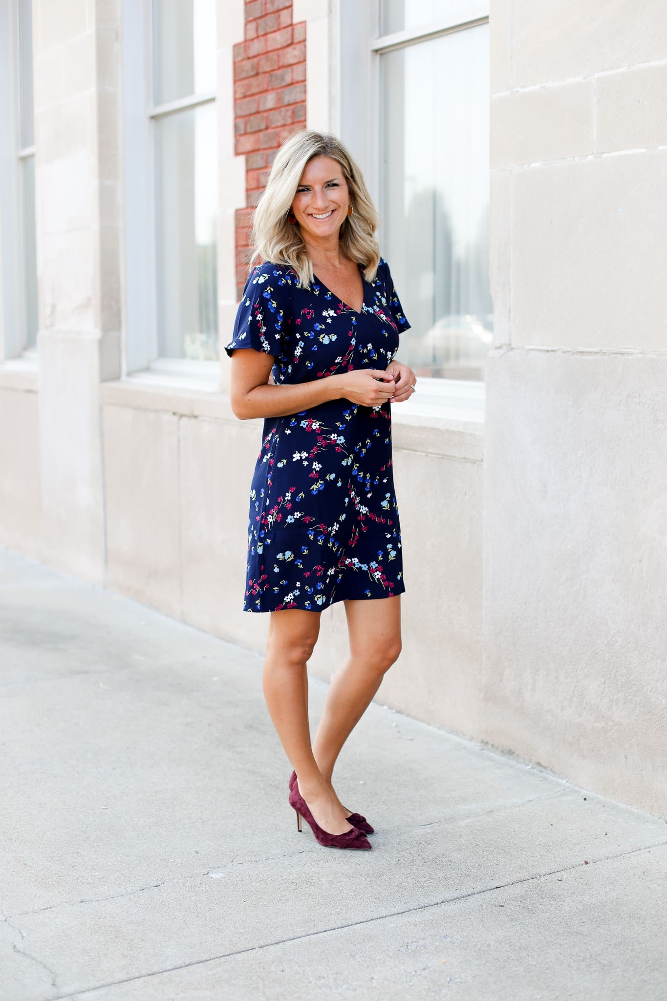 When I saw this dress, I knew it was the perfect summer to fall dress for the workplace. For starters, it’s short sleeves which keeps it warm weather friendly, yet the colors lend themselves perfectly to the upcoming fall months. If chilly, add a coordinating cardigan or jacket and you have yourself a cooler weather option. The lace shoulder detail and work appropriate length are the perfect finishing touches on this piece! Paired with these suede bow pumps [fun fact: bows are BACK for fall big time!] I can’t get over the beautiful scarlet color and the under 3-inch heel makes them easy to walk in all day long!
