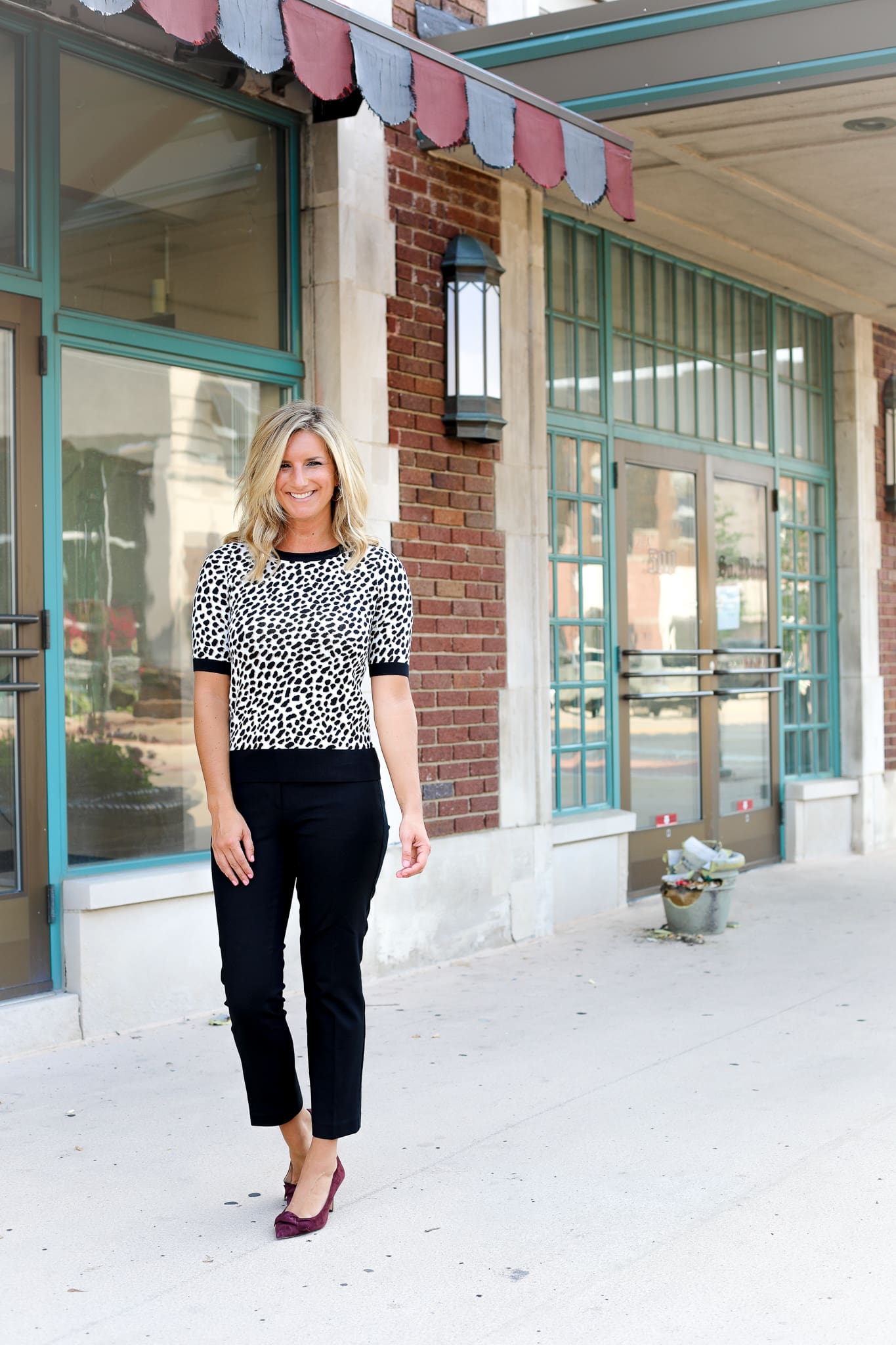 Another huge trend for fall – animal print [I’m not one bit mad about it]. This short sleeve sweater is still summer appropriate but ready for fall to take cover with this twill moto jacket which screams sophistication and fun. You must hold this jacket to know how good it is. Paired with a classic pair of black ankle dress pants and the same great suede heels and you’re ready to go [and turn heads in the process]. Meow.