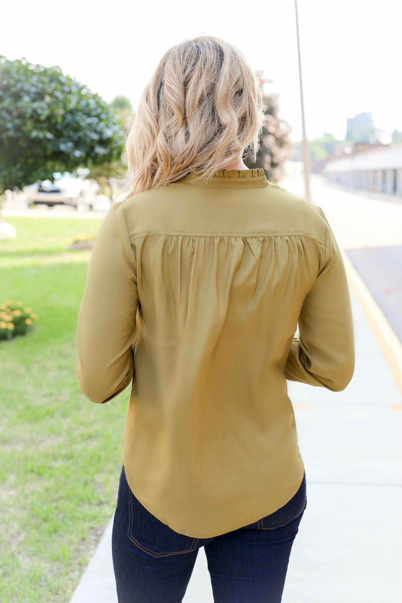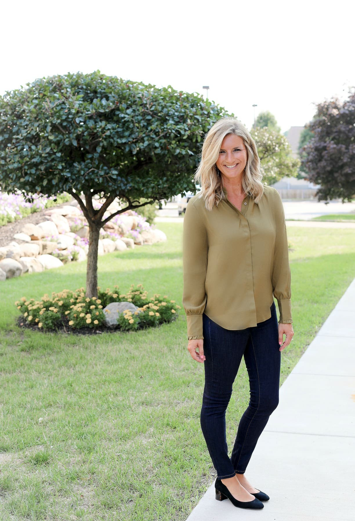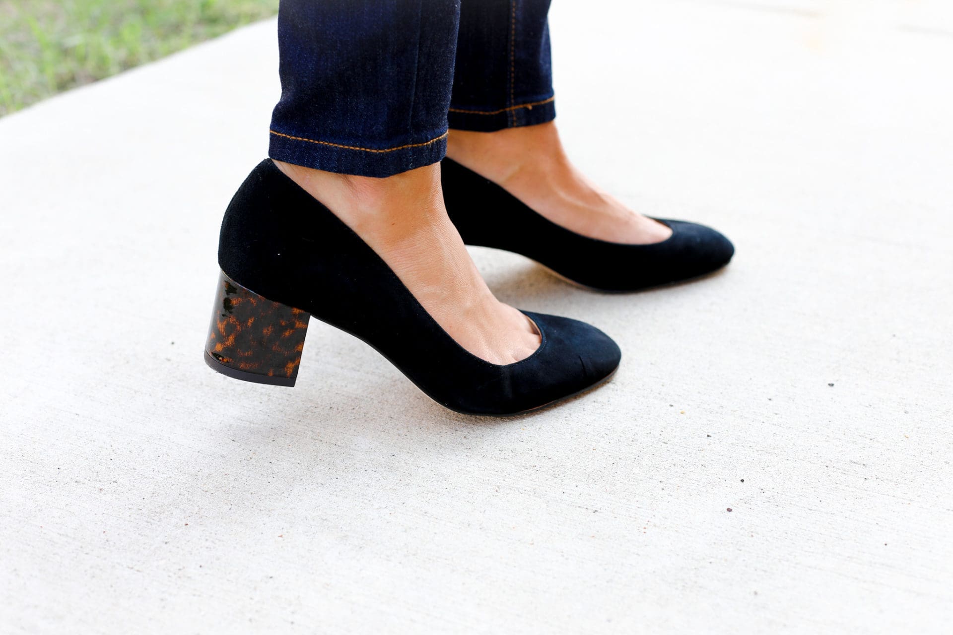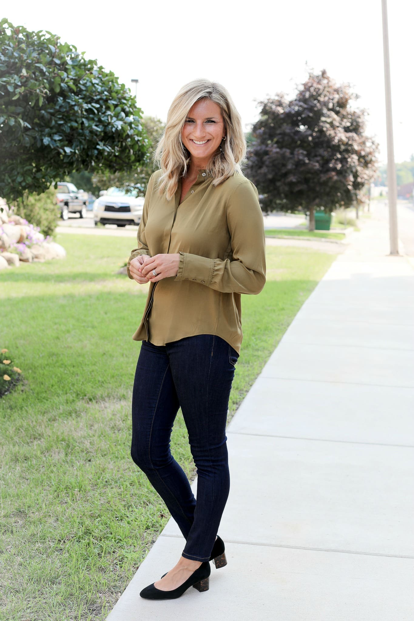 Now it’s time for our favorite day of the week – casual Friday! Obviously, first things first, switching out the basic black pants for beloved denim. I went with these oh so perfect bootcut jeans that fit just right and allowed for these suede pumps with the tortoiseshell heel [I die]. Speaking of tortoiseshell, can we talk about these earrings for a minute? Good, right? Monday – Friday, you will find these beauties in my ears. To top off this look, turn to this classic ruffle neck button down blouse in olive which combines business with play.