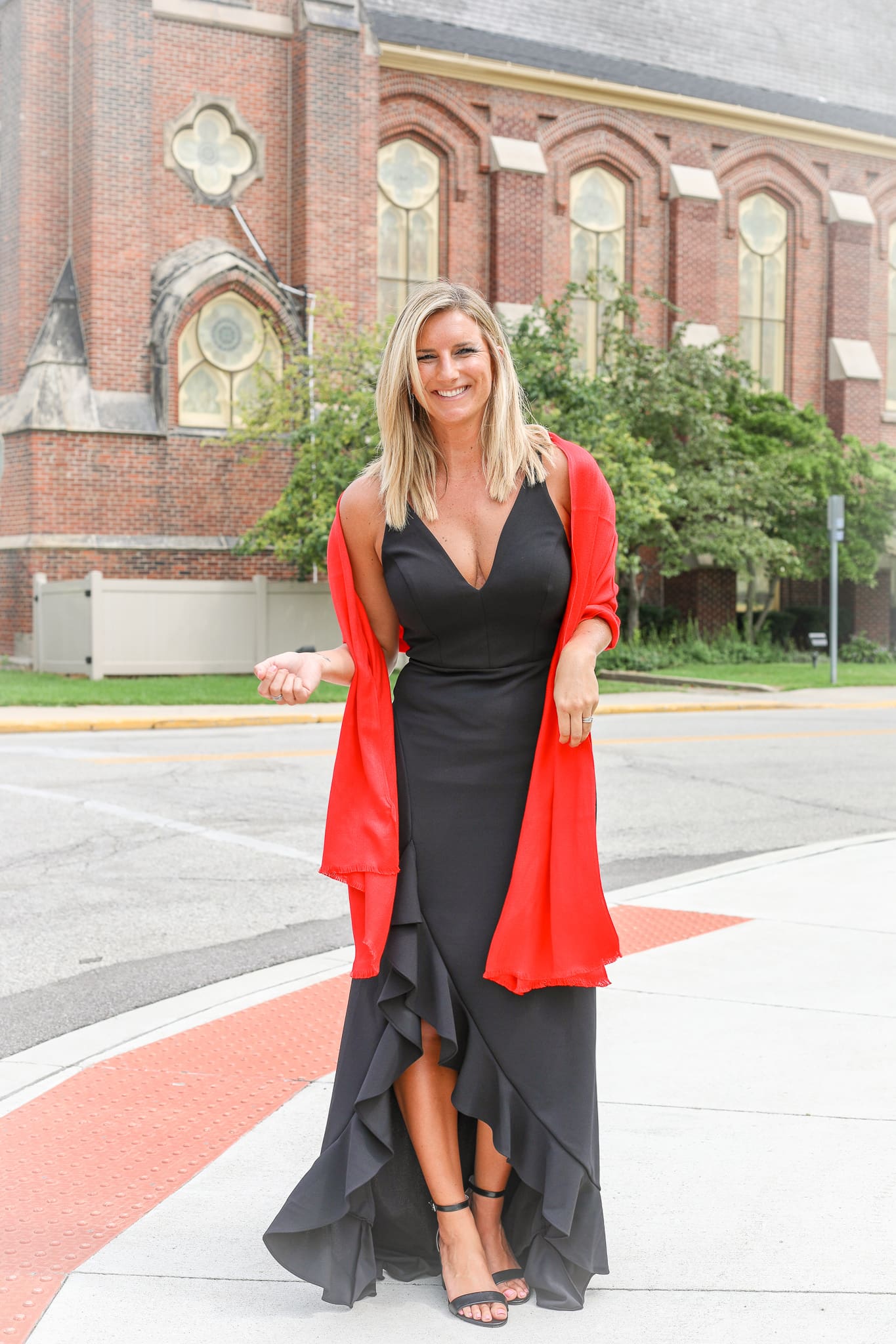 Finally, let’s say you get invited to the DREAM- a black tie or formal fall wedding. A formal wedding dress code tends to mean a floor length gown or a very dressy, shorter, cocktail dress. While there are options with sleeves for those cooler fall days, I like to bust a move [bring the sweat] on the dance floor. So with the long length, I chose to keep my arms uncovered, and add on a wrap to use for the ceremony portion and outdoors. I am OBSESSED with the ruffles and cut on the bottom of this dress. Plus, the red version kind of makes me think I could be the dancing emoji girl.