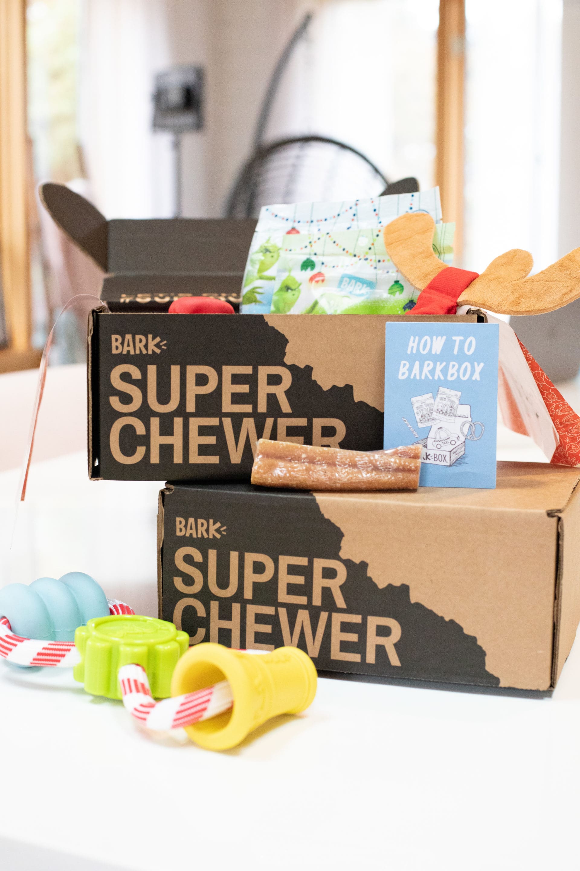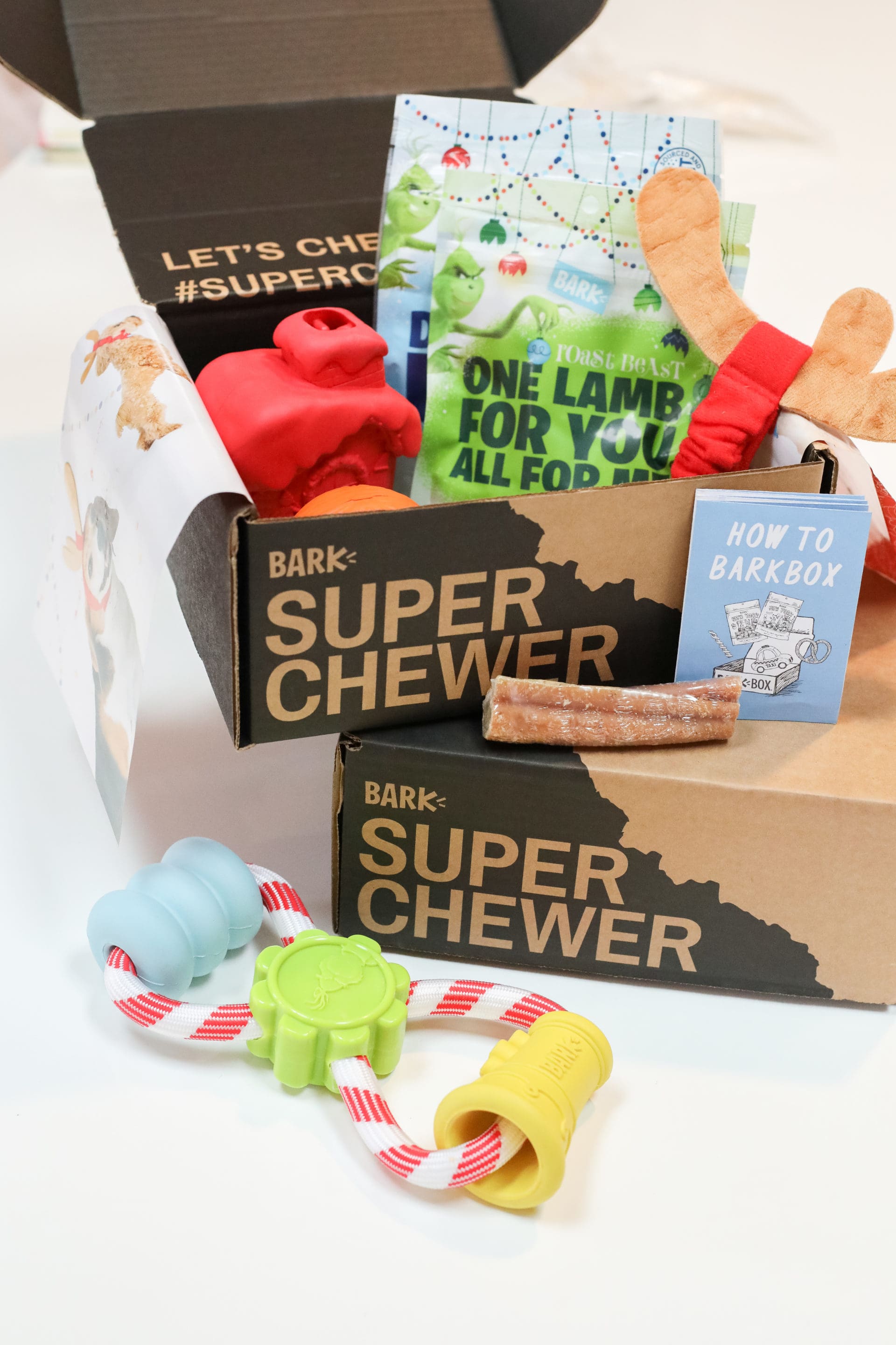 Insert the Super Chewer Box. A monthly delivery of 6 tough and durable items (over $50 in value) that your super chewin’ dog will love. Monthly themes are seasonal, fun, and crafted right in NYC with Bark’s own characters! If you have a dog or dogs that love to chew in your life, this is the box for you. All treats are free of soy, wheat, or corn. All meat is sourced in the USA and all treats are made in the USA and Canada.