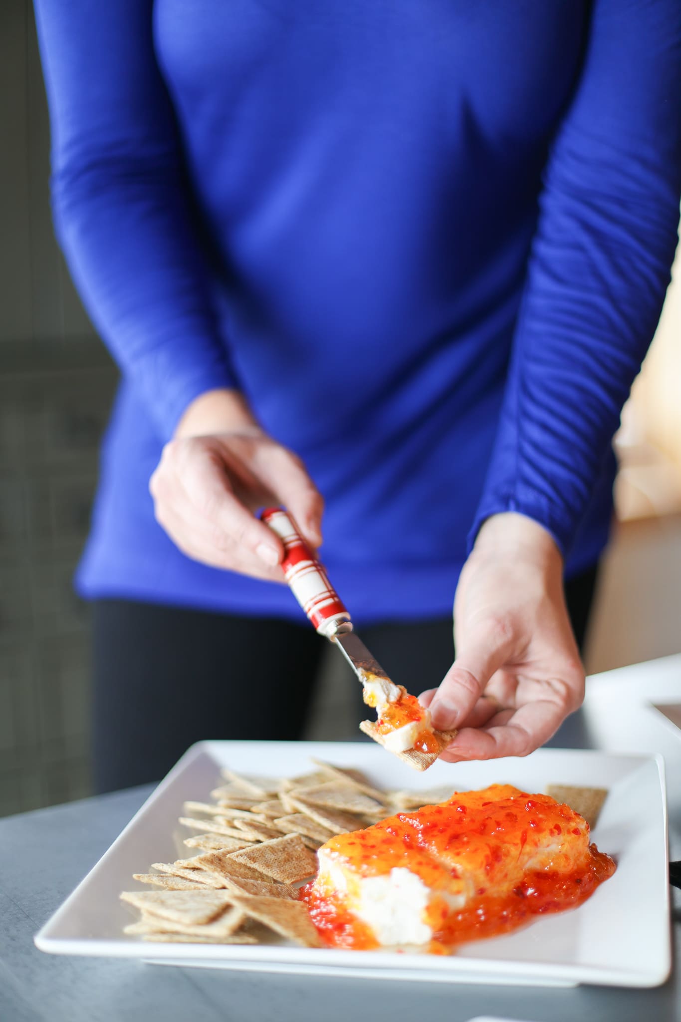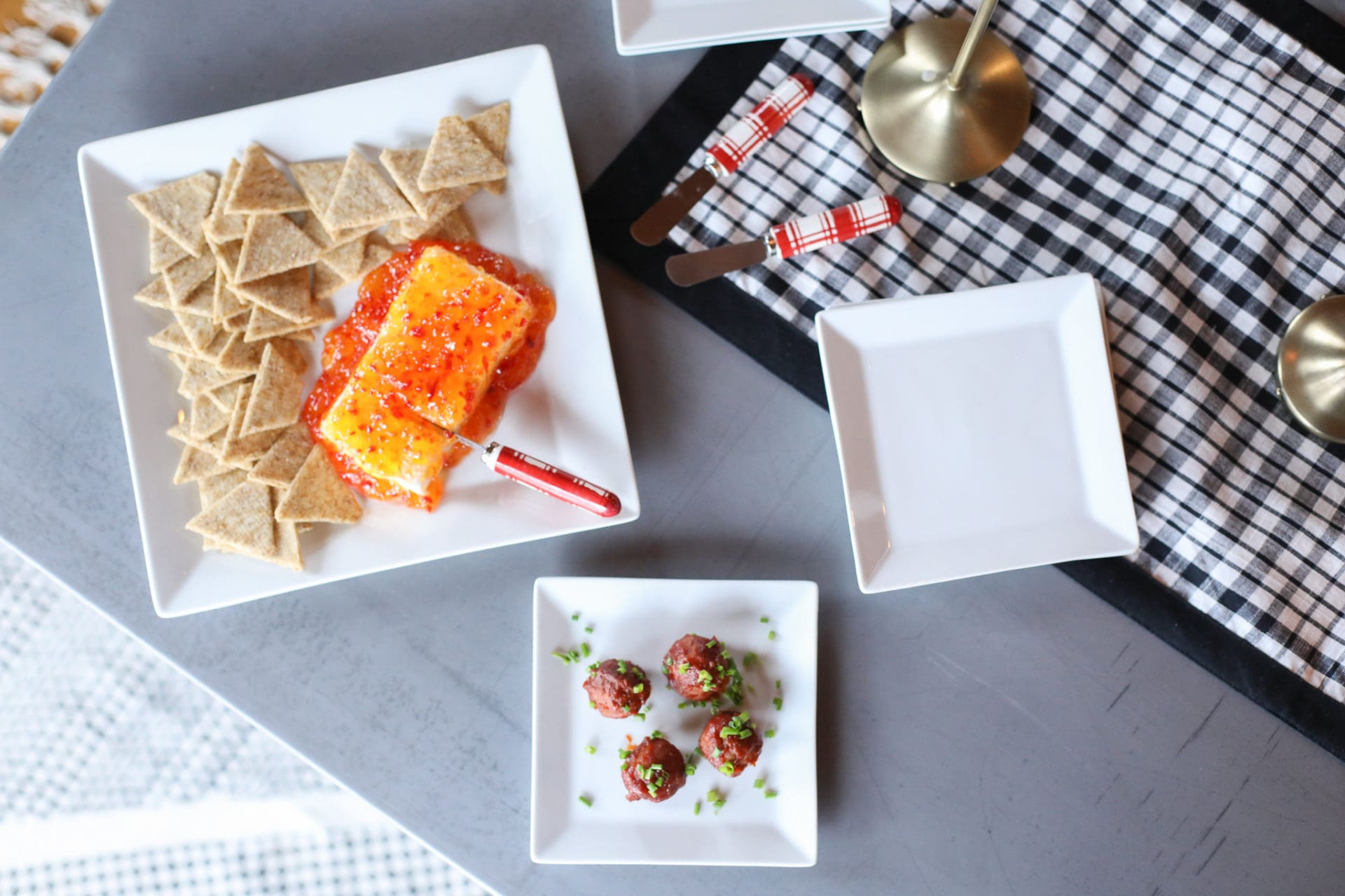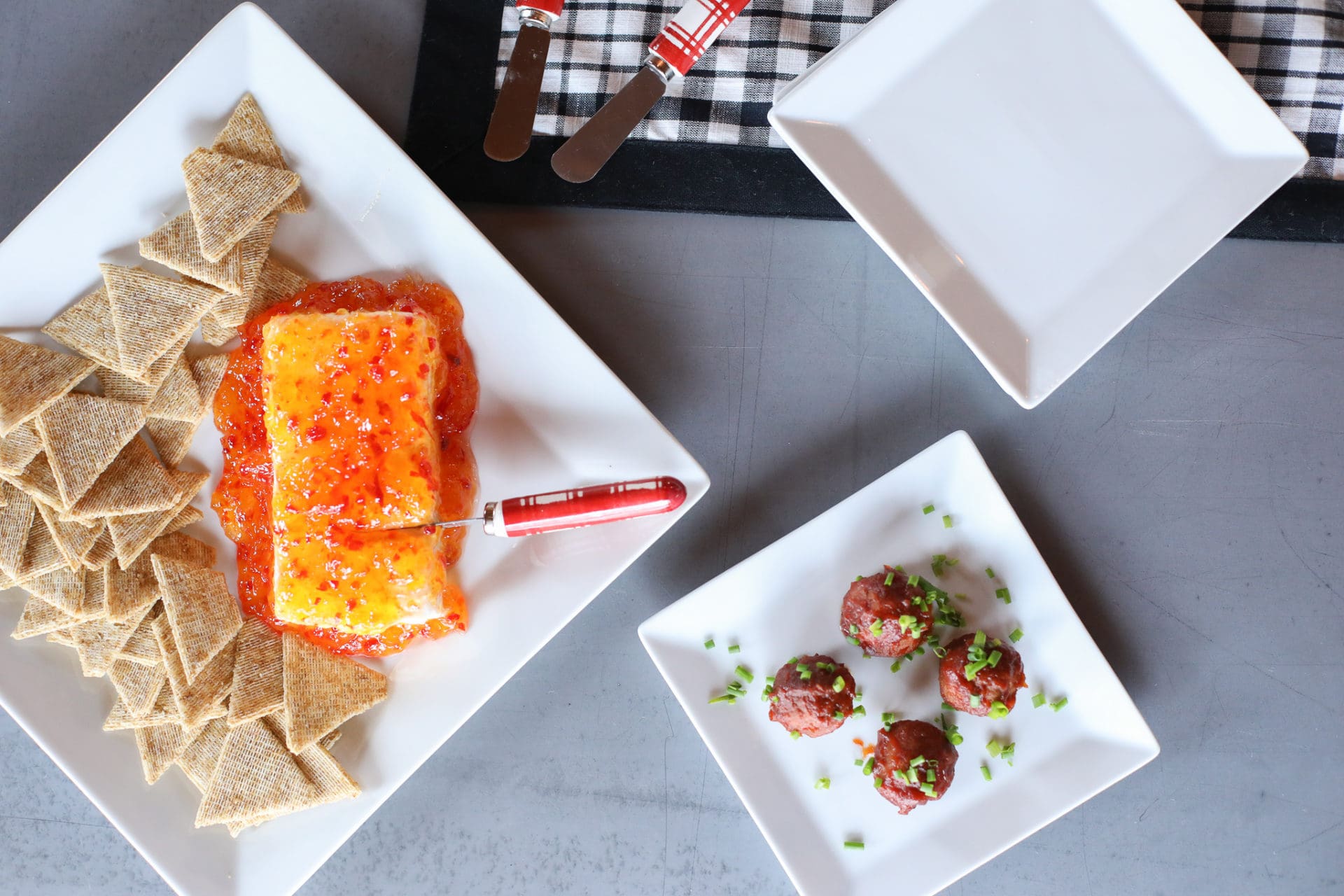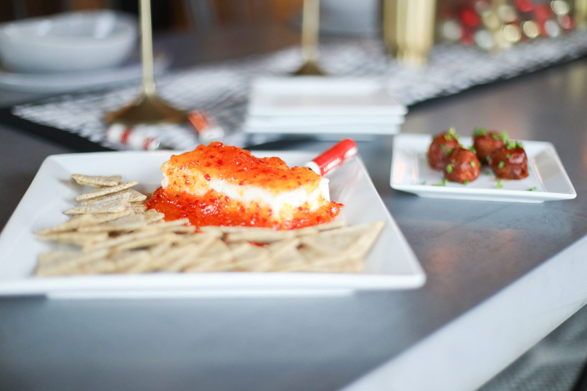 To make, simply put your block of cream cheese on a platter [I love the simplicity of these The Cellar Whiteware Square Dinner Plates for presentation all year round], pour your jam or jelly over your cream cheese and serve alongside your favorite cracker! A little bit sweet and a little bit of heat. Include a festive spreader and you’re guests will be coming back for more over and over and over again.