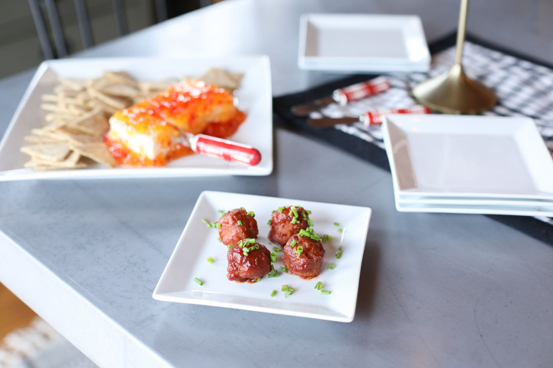 To make this, simply combine all of the above ingredients and place in a slow cooker on low for a couple of hours to heat up in a slow cooker and allow the flavors to blend. If you would like your meatballs to be easy to grab for guests, place a few on these classic Square Appetizer Plates and garnish with chives for a nice presentation. This Rachael Ray Lil’ Huggers 2-Pc. Tongs Set can come in handy as well for grabbing those little balls of goodness.