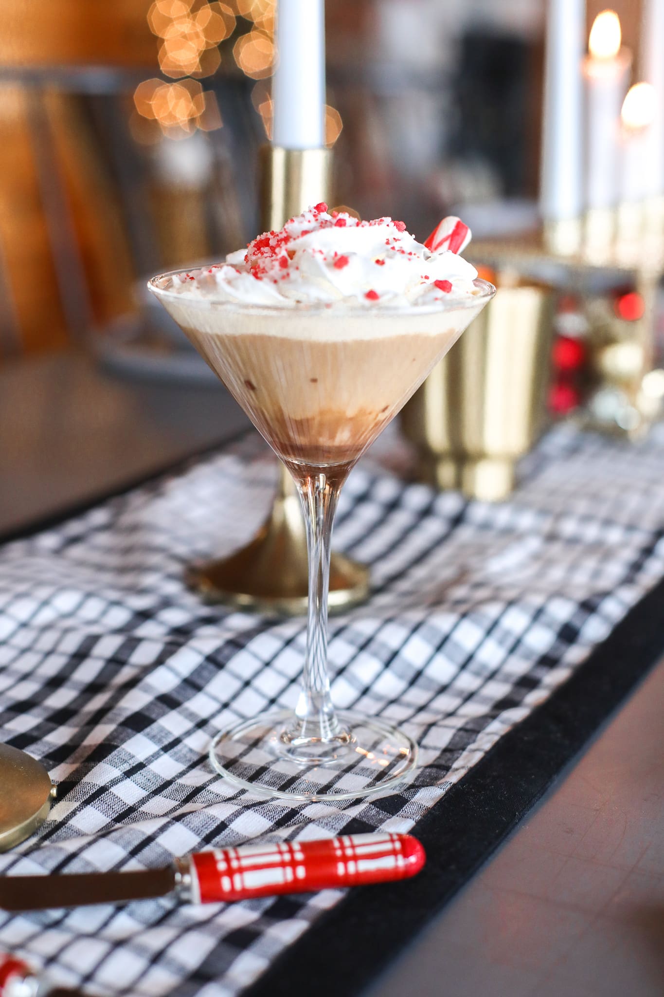 First, pour a little chocolate syrup in your martini glass. Then pour in coffee, half and half, peppermint. Garnish with whipped cream, sprinkles and peppermint sticks for the full affect.