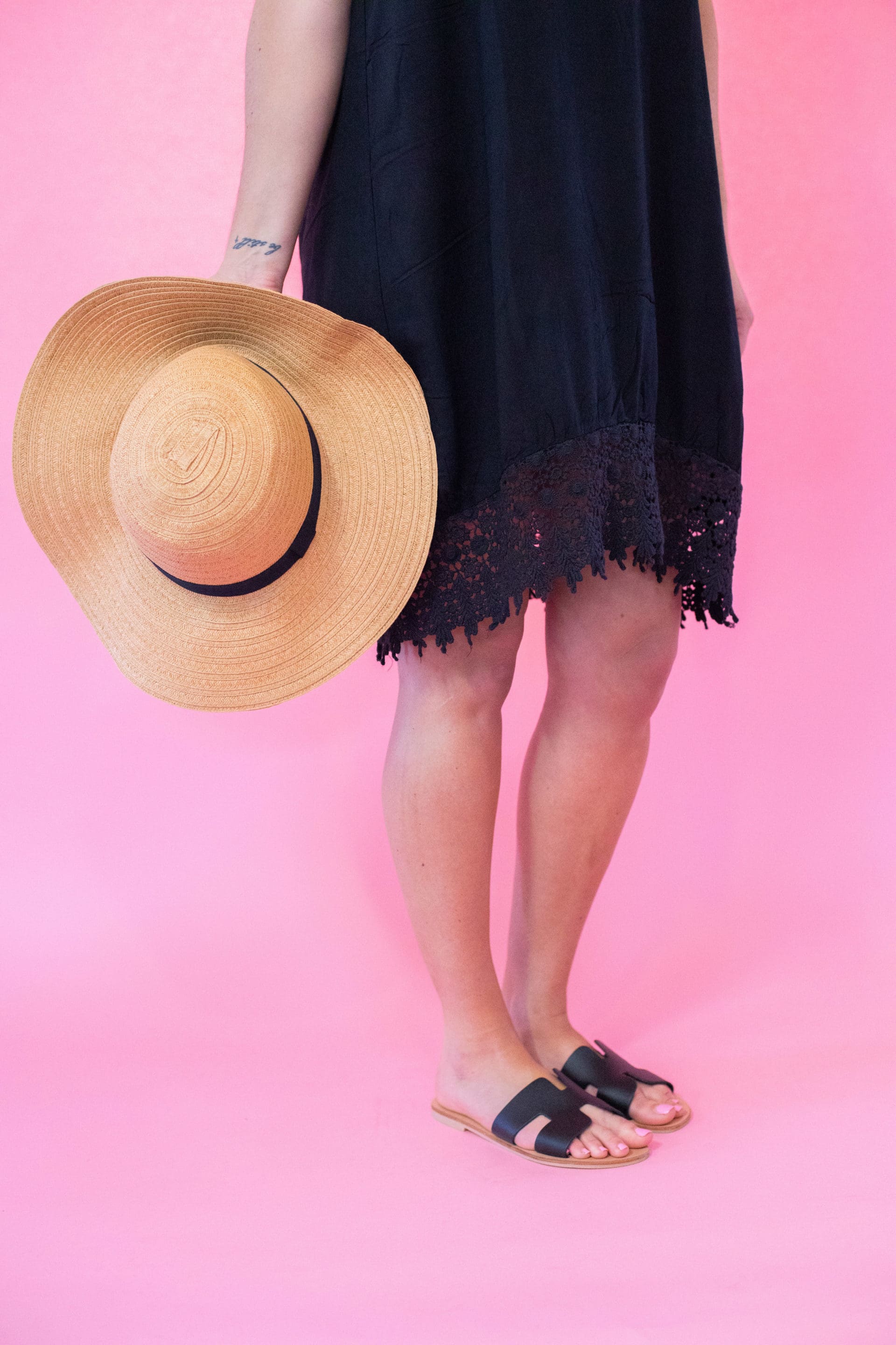 Raviya Crochet-Trim Cover-Up Women Swimsuit [true to size, wearing in small] // I.N.C. Grosgrain Woven Floppy Hat // Steven by Steve Madden Greece Sandals [true to size]