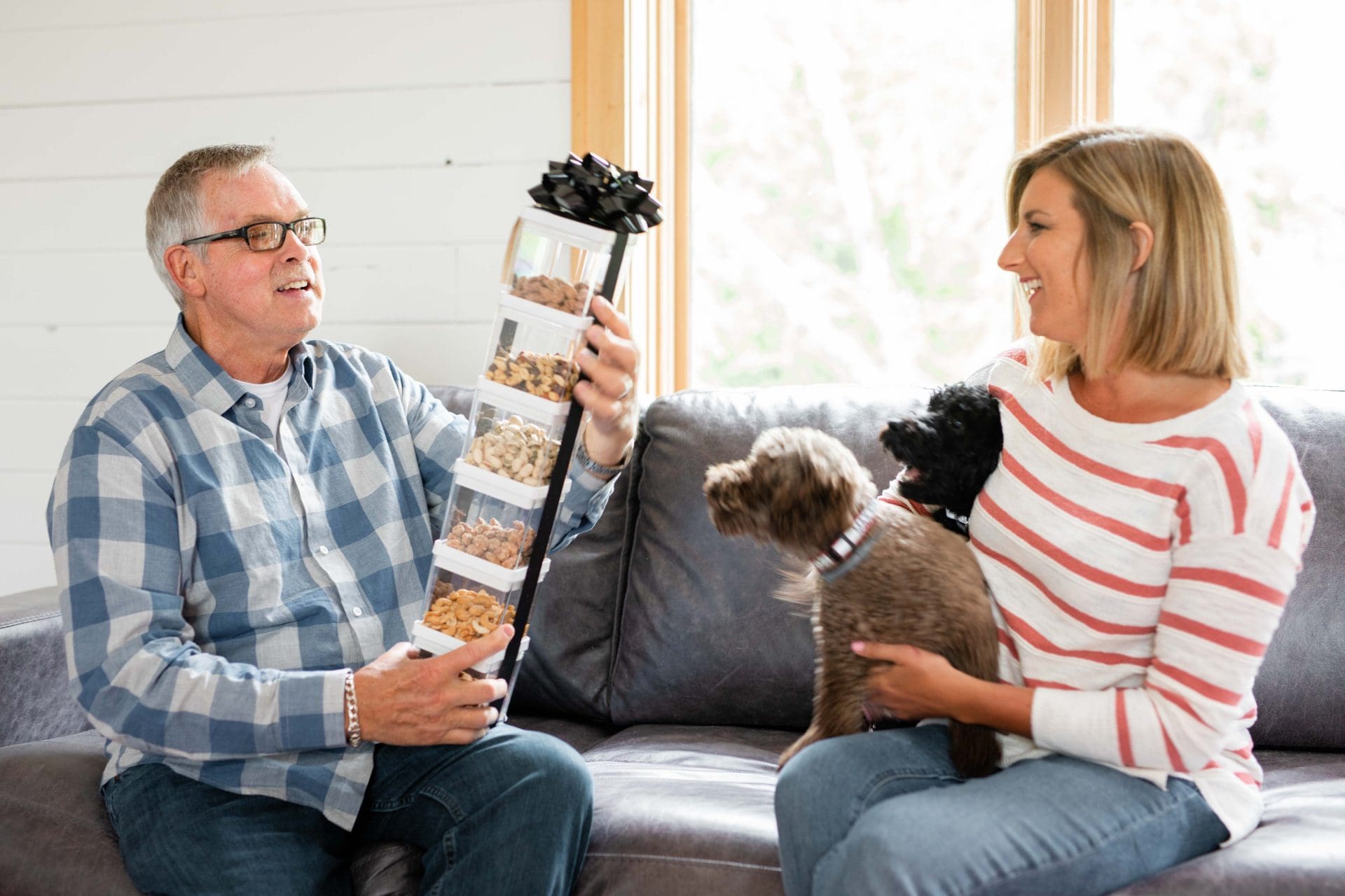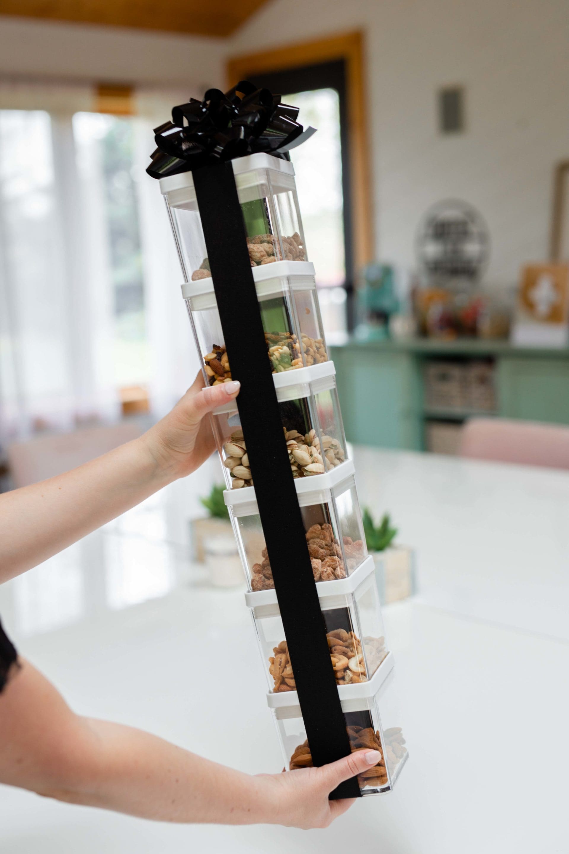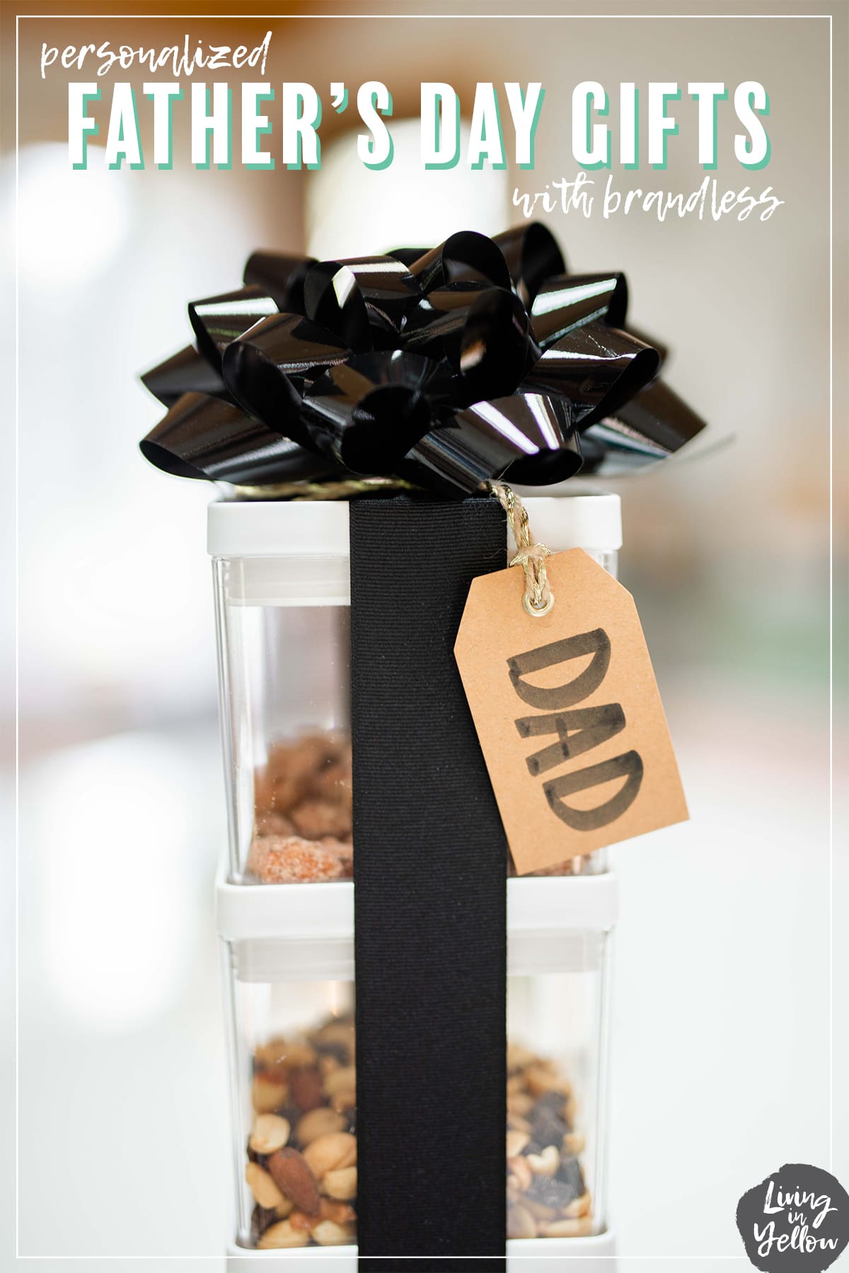 Nuts, nuts and more nuts! If your dad loves to snack, this is a great gift for him! This bundle includes almonds, trail mix, pistachios and cashews! We picked up some small canisters and poured each bag of nuts inside. These containers stacked easily and we secured the tower with some wide black ribbon and a bow on top. Super simple, but it has a fun visual effect!