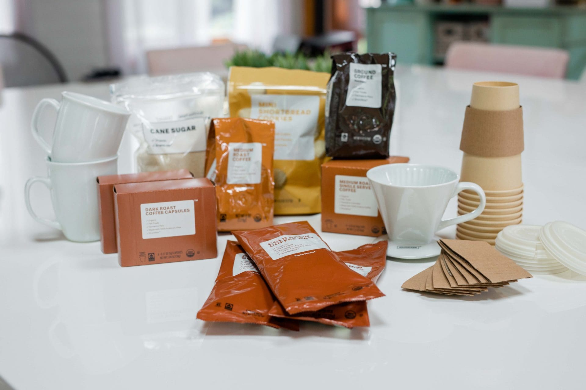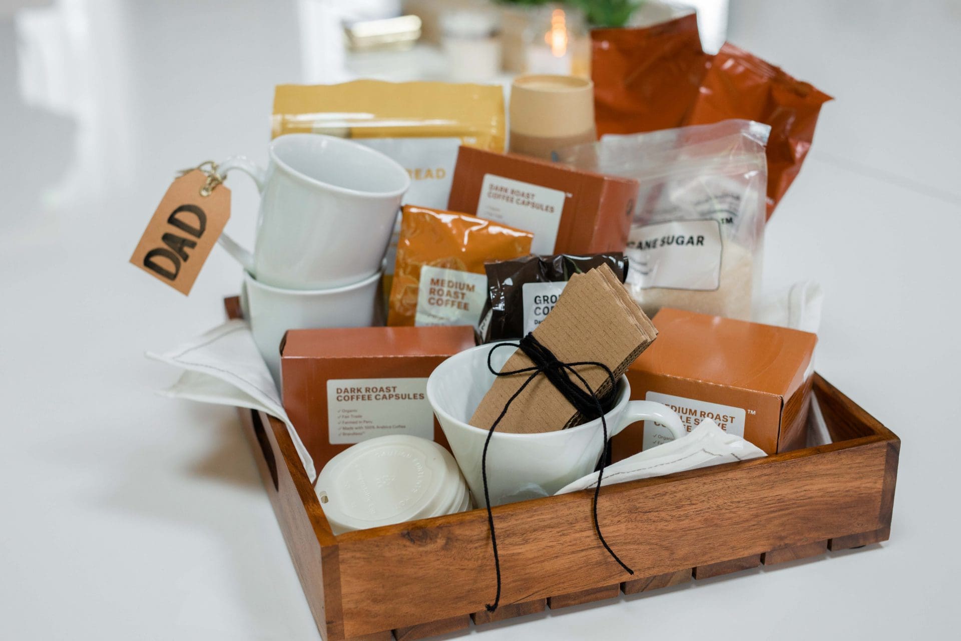 Coffee, coffee, coffee! This bundle is filled with coffee pods, coffee grounds, and all the fixings! We added a few extra cold brew bags because more cold brew is never a bad thing! To make this bundle into a gift basket of sorts, we grabbed a tray for an easy coffee-in-bed set up or to carry your coffee out to the patio, layered in a classic linen tea towel and then piled on the items from the coffee bundle!