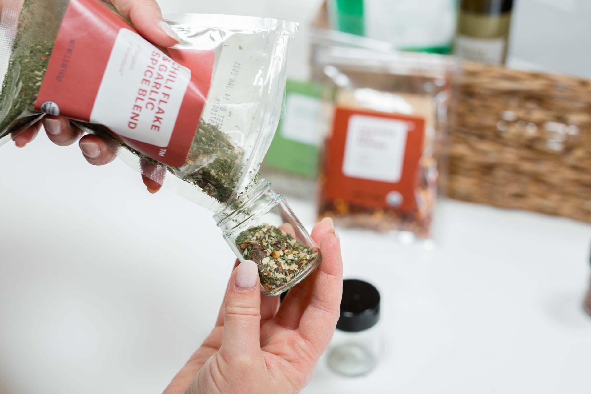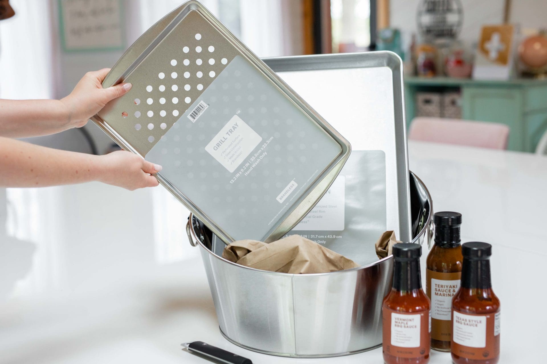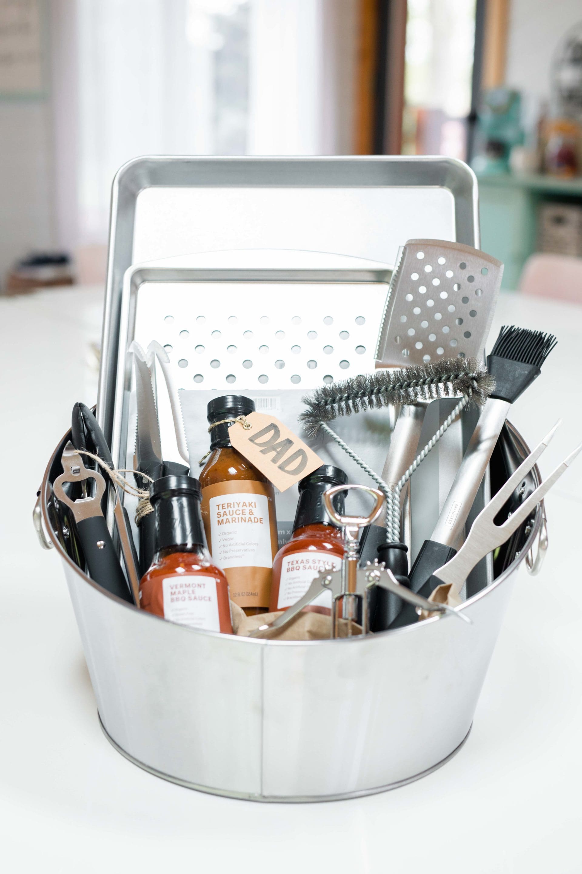 Gift Basket Tip: An angled basket like this one [or the drink dispenser we used for the BBQ Prep Bundle] helps to show off your gift items. You can also put some kraft paper into basket and add items on top [the paper we used was reused from the packaging from the bundle]. This helps so that your smaller items don’t get lost at the bottom of the basket.