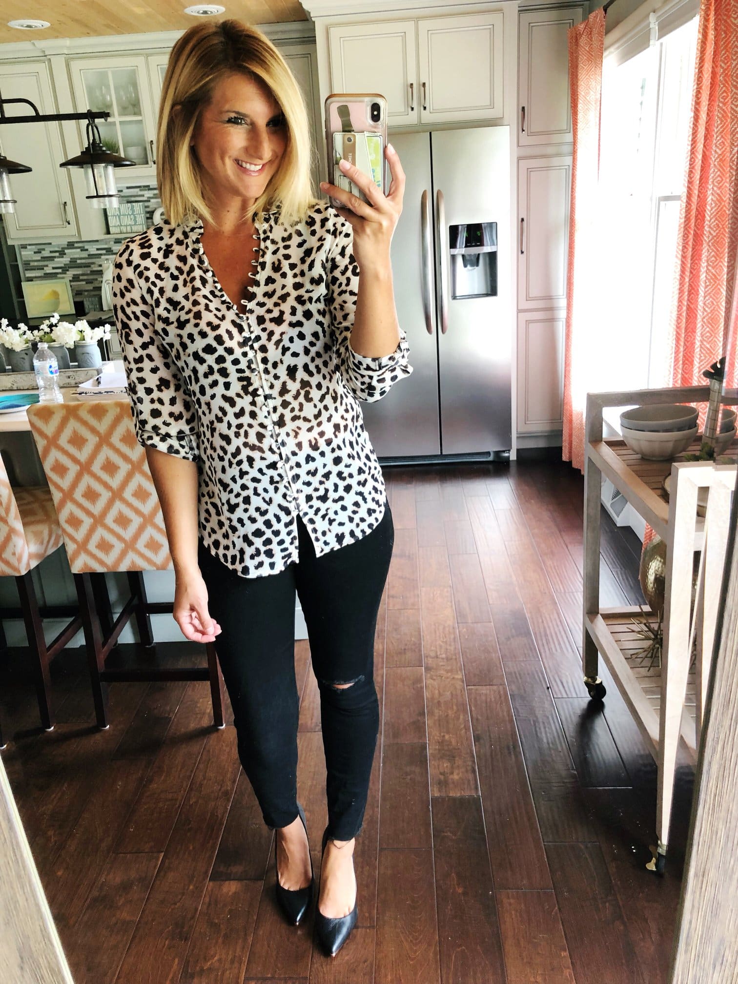 Slim Fit Leopard Ruffle Chiffon Portofino Shirt – Express [TTS, wearing in S] // Donna Ripped High Waist Ankle Skinny Jeans • KUT from the Kloth [TTS] // Hazel Pointy Toe Pump • Sam Edelman [TTS]