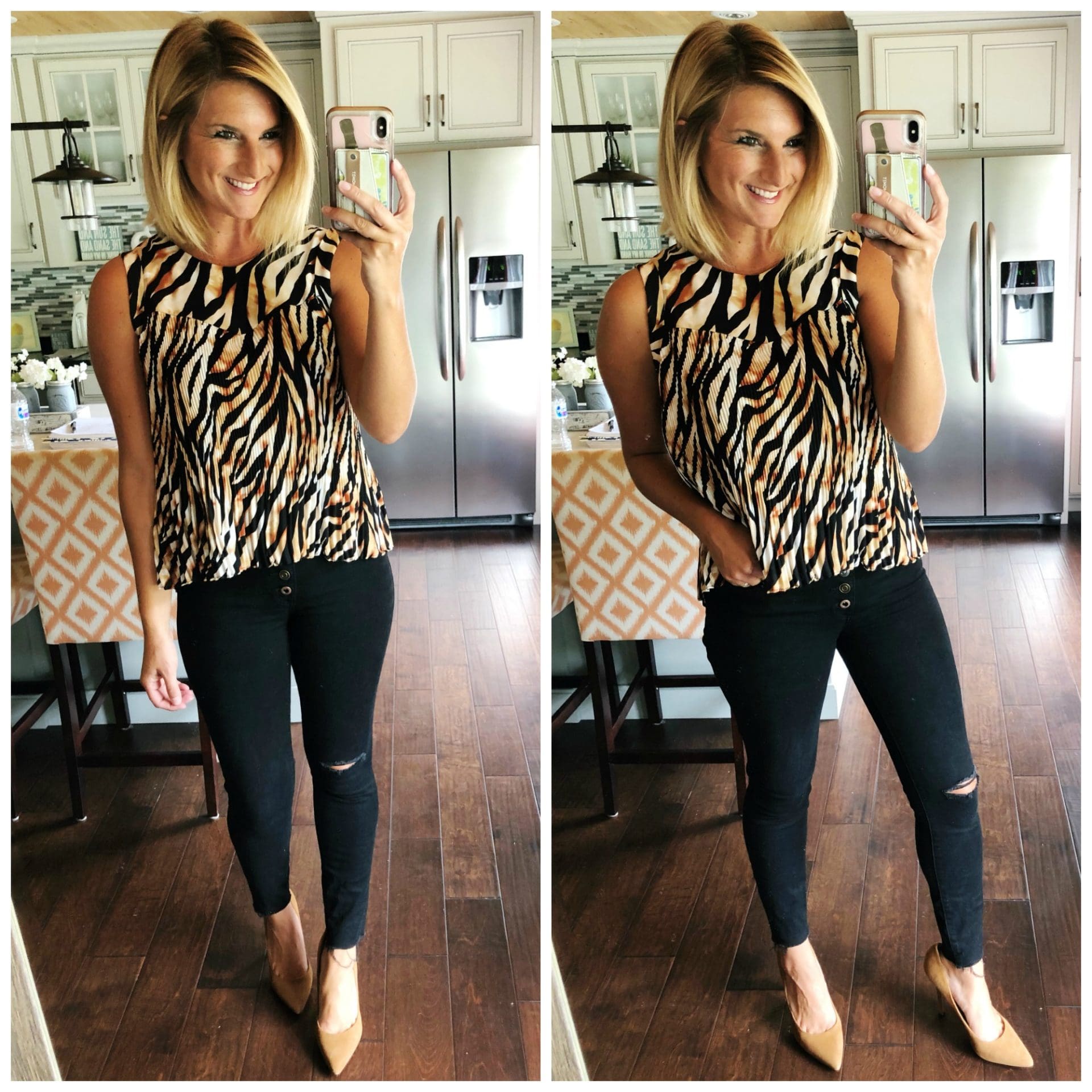 Gibson x Hot Summer Nights Roselyn Pleated Sleeveless Top • Gibson [TTS] // Donna Ripped High Waist Ankle Skinny Jeans • KUT from the Kloth [TTS] // Maxx Pointy Toe Pump • Charles by Charles David [TTS]