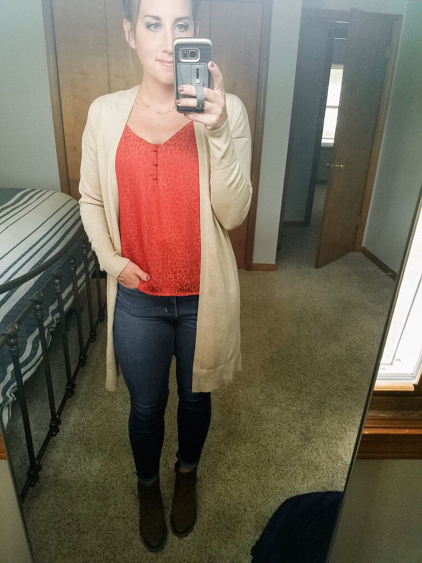 There is nothing better than a good layering cami that can be worn alone or layered under a cardigan! This new tonal leopard print in rust has me ready for Fall and pairs perfectly with this cardigan! The length of this cami is also perfect for my petite frame and budget friendly! [True to size, wearing in XS]