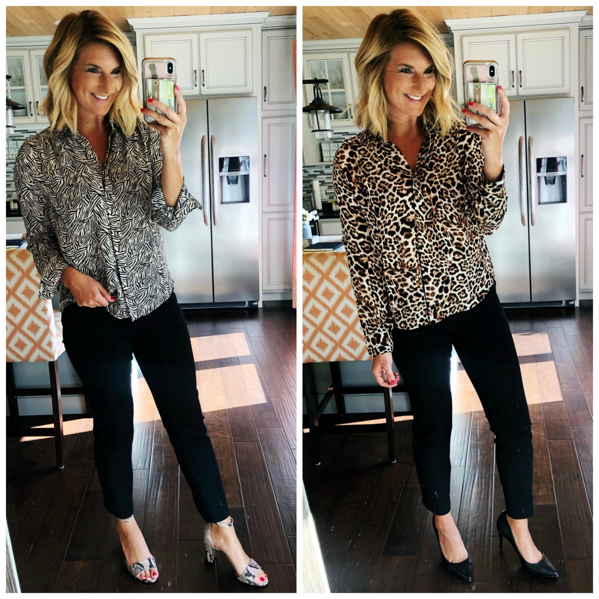 Gibson x City Safari Jamie Shrayber Animal Print Hidden Placket Shirt [TTS, wearing in XS] // Kelsey Knit Trouser Super Stretch Ponte – Liverpool [TTS] // Corlina Ankle Strap Sandal • Vince Camuto [TTS] // Izibeli Pump • Ted Baker [TTS]