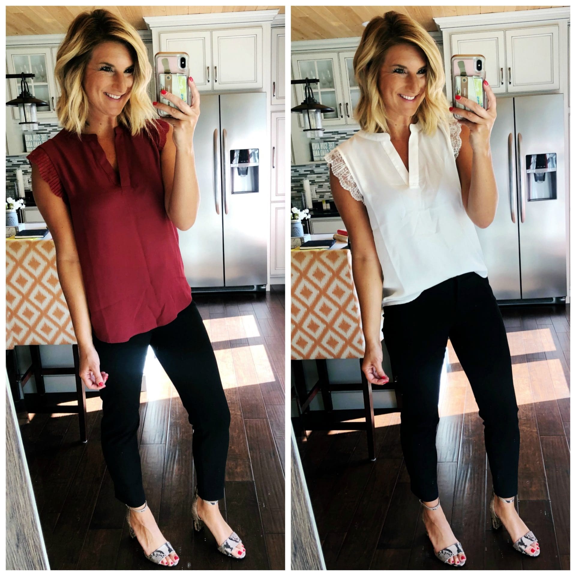 Gibson x City Safari Roselyn Weaver Split Neck Lace Trim Top [TTS, wearing in XS] // Kelsey Knit Trouser Super Stretch Ponte – Liverpool [TTS] // Corlina Ankle Strap Sandal • Vince Camuto [TTS]