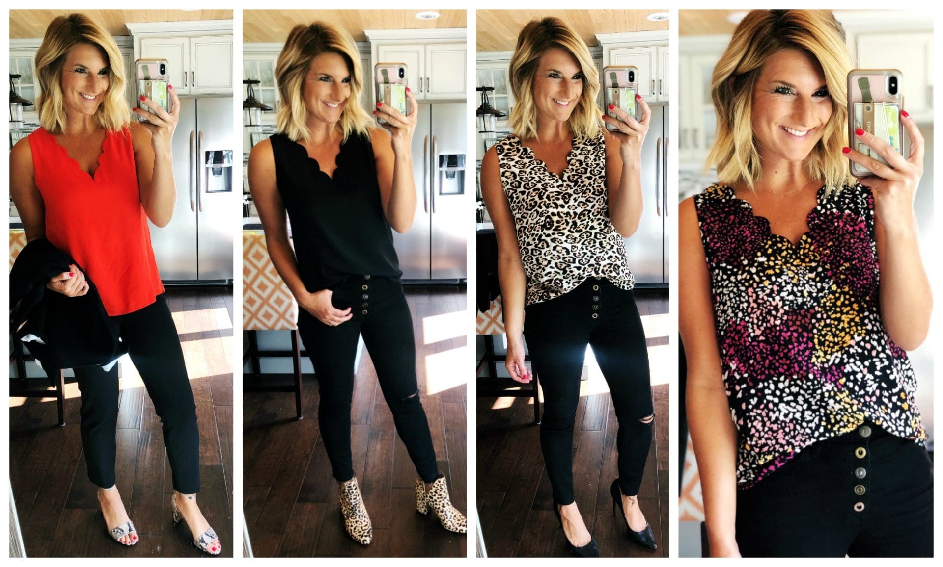 Gibson x City Safari Collection Living in Yellow Scalloped V Neck Tank [TTS, wearing in XS] // Kelsey Knit Trouser Super Stretch Ponte – Liverpool [TTS] // Corlina Ankle Strap Sandal • Vince Camuto [TTS] // Notch Collar Cotton Blend Blazer • Gibson [TTS] // Donna Ripped High Waist Ankle Skinny Jeans • KUT from the Kloth [TTS] // Rockstar Genuine Calf Hair Bootie • Steve Madden [TTS]