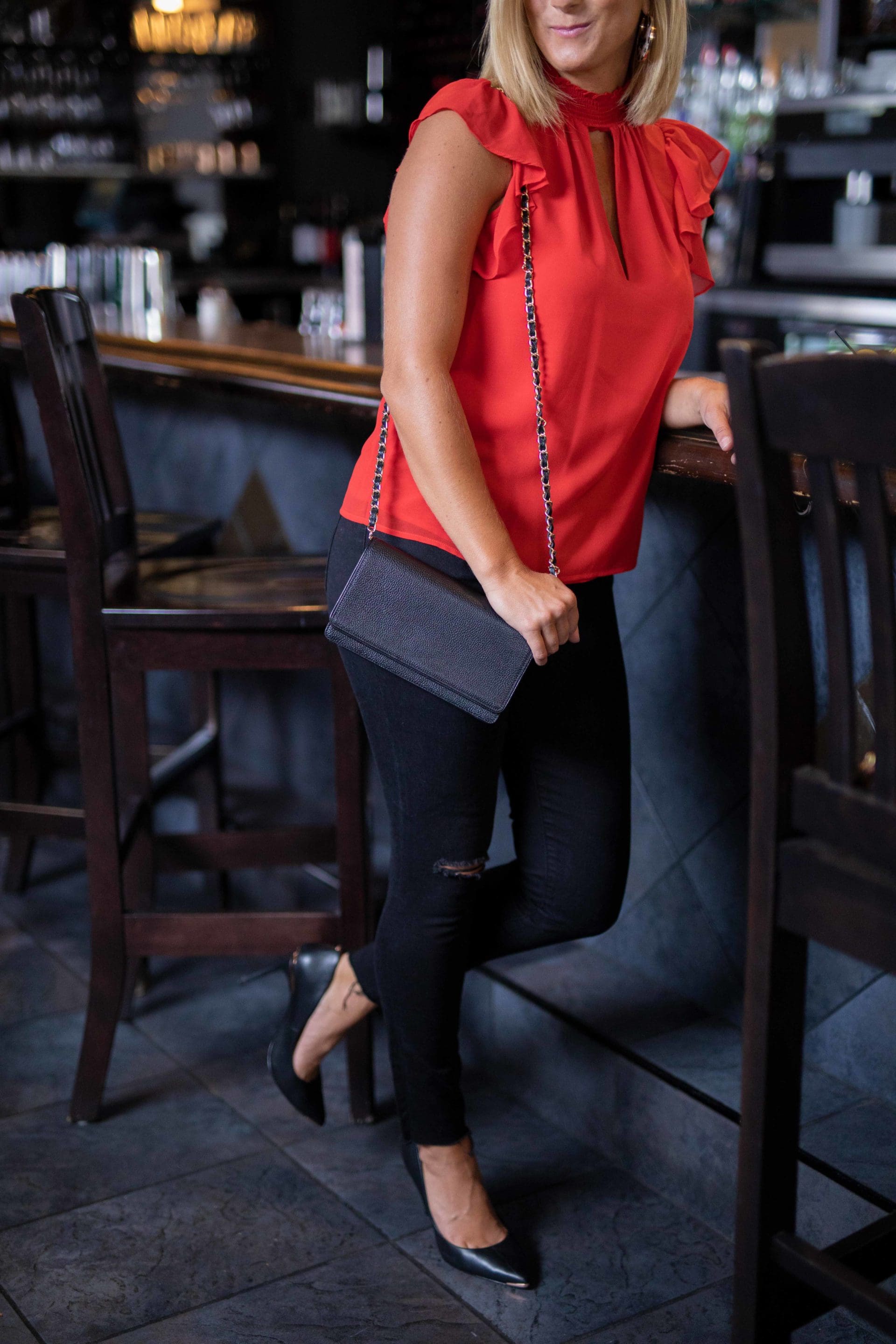 Who run the world? GIRLS! You slip on your new favorite top — a saucy red number with a mock turtle neck, cute keyhole and flirty ruffles — and pair it with your go-to black jeans and pumps for your night on the town! As you head out the door, you grab a classic black leather clutch — let the good times begin!