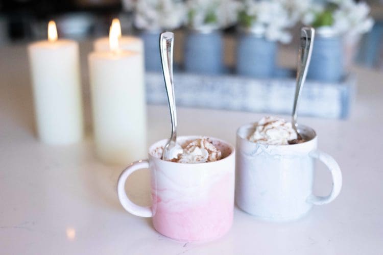 You toss together two little mug cakes in your cute marble mug set [see recipe below] and Mmmmm…..how can a dessert cooked for a few seconds in the microwave be so dang delicious?! You scarf yours down, and take a bite out of the second before handing it off to your guy. Whoops, sorry hunny! You crawl into your cozy bed and fall quickly asleep to sweet dreams!