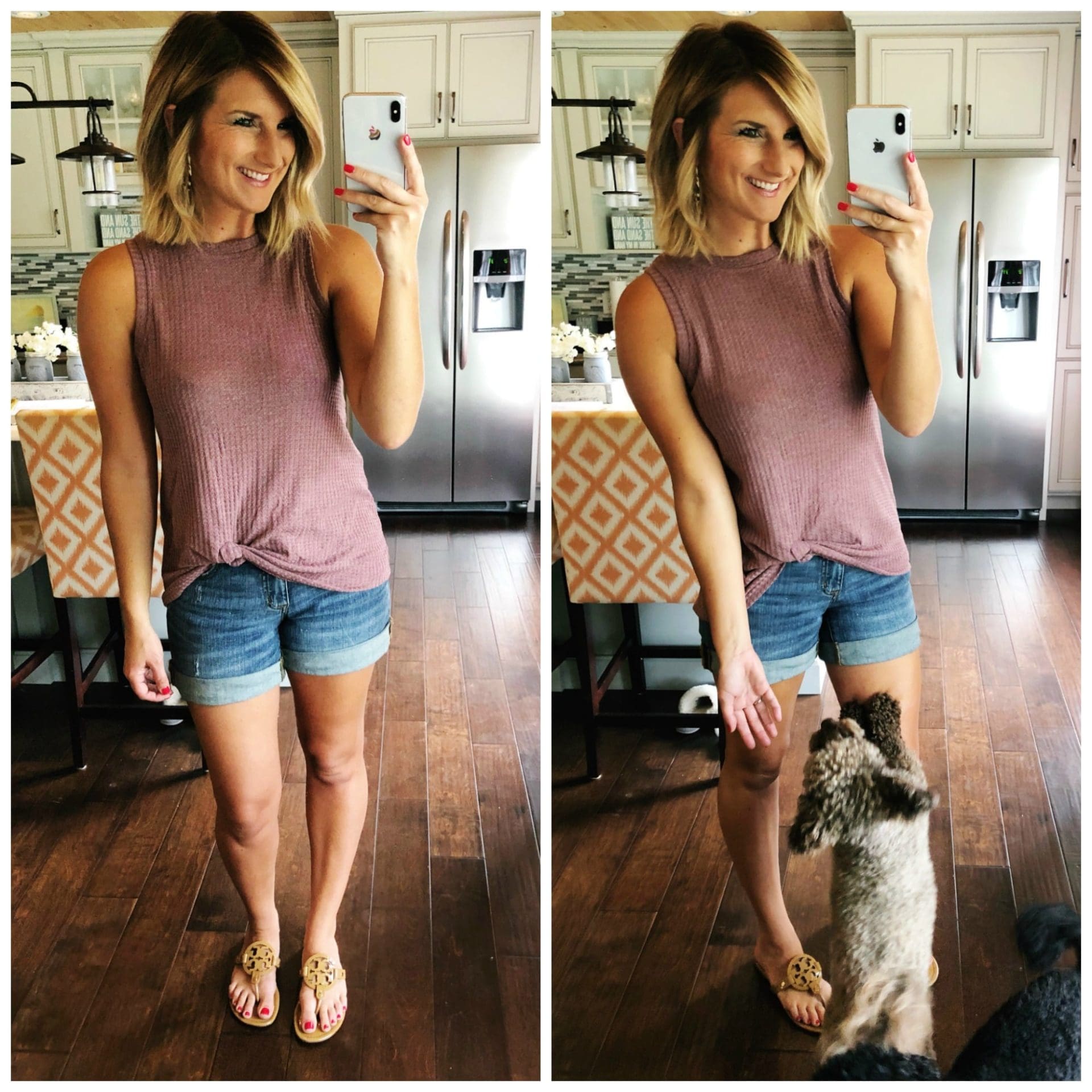 Sleeveless Twist Knot Waffle Knit Top – Amazon [TTS, wearing in S] // Similar Shorts Mid-Rise Rolled Hem Boyfriend Jean Shorts – Universal Thread // Miller Flip Flop • Tory Burch [Size up .5] // Octagon Hoop Earrings – Amazon