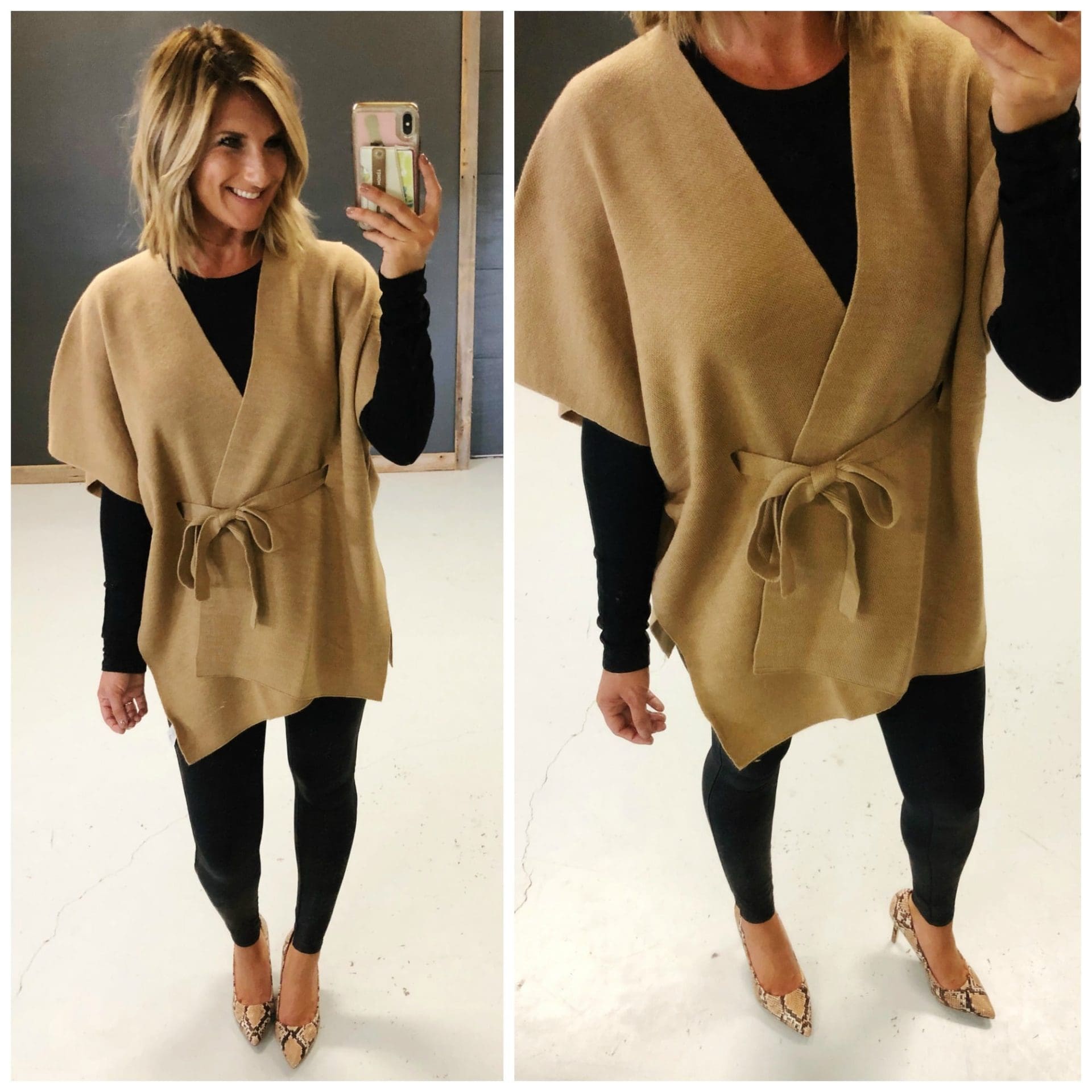 Belted Knit Wrap • LOFT [On sale! TTS, wearing in XS] // Long-Sleeve Shirt with Shirttail Hem – Daily Ritual [Size up if in between, wearing in S] // Faux Leather Leggings • Spanx [Size up if in between, wearing in S] // Mary Jane Pump – find. [TTS]