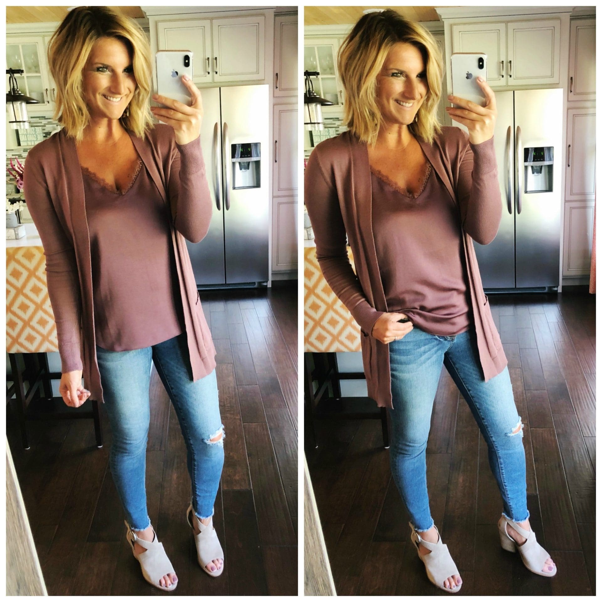 Wide Placket Cardigan • Express [TTS, wearing in S] // Lace Neck Downtown Cami • Express [TTS, wearing in S] // Connie High Rise Ankle Skinny Jeans – Kut from the Kloth [On sale! TTS] // Vega Sandal • Marc Fisher [On sale! TTS]