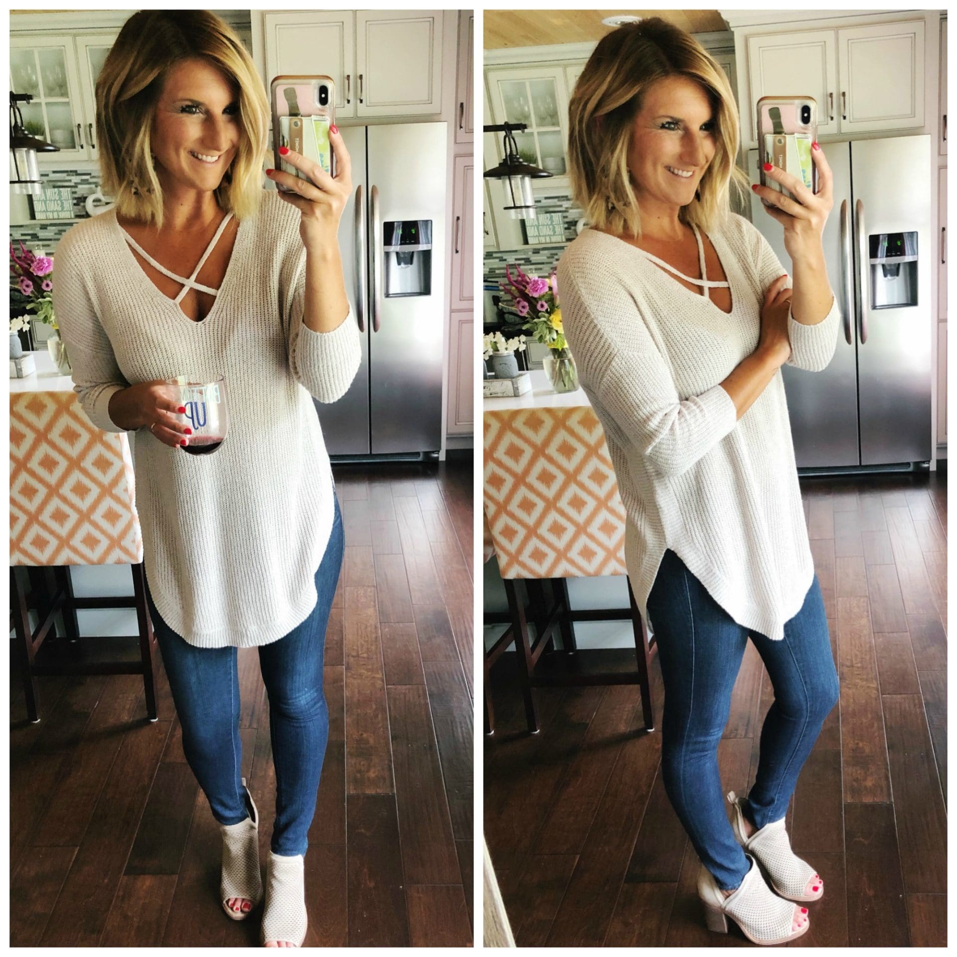 Strappy Circle Hem Tunic Sweater • Express [TTS] // High Rise Stretch Ankle Skinny Jeans • Liverpool [TTS] // Kensa Peep Toe Bootie – Vince Camuto [On sale! TTS]