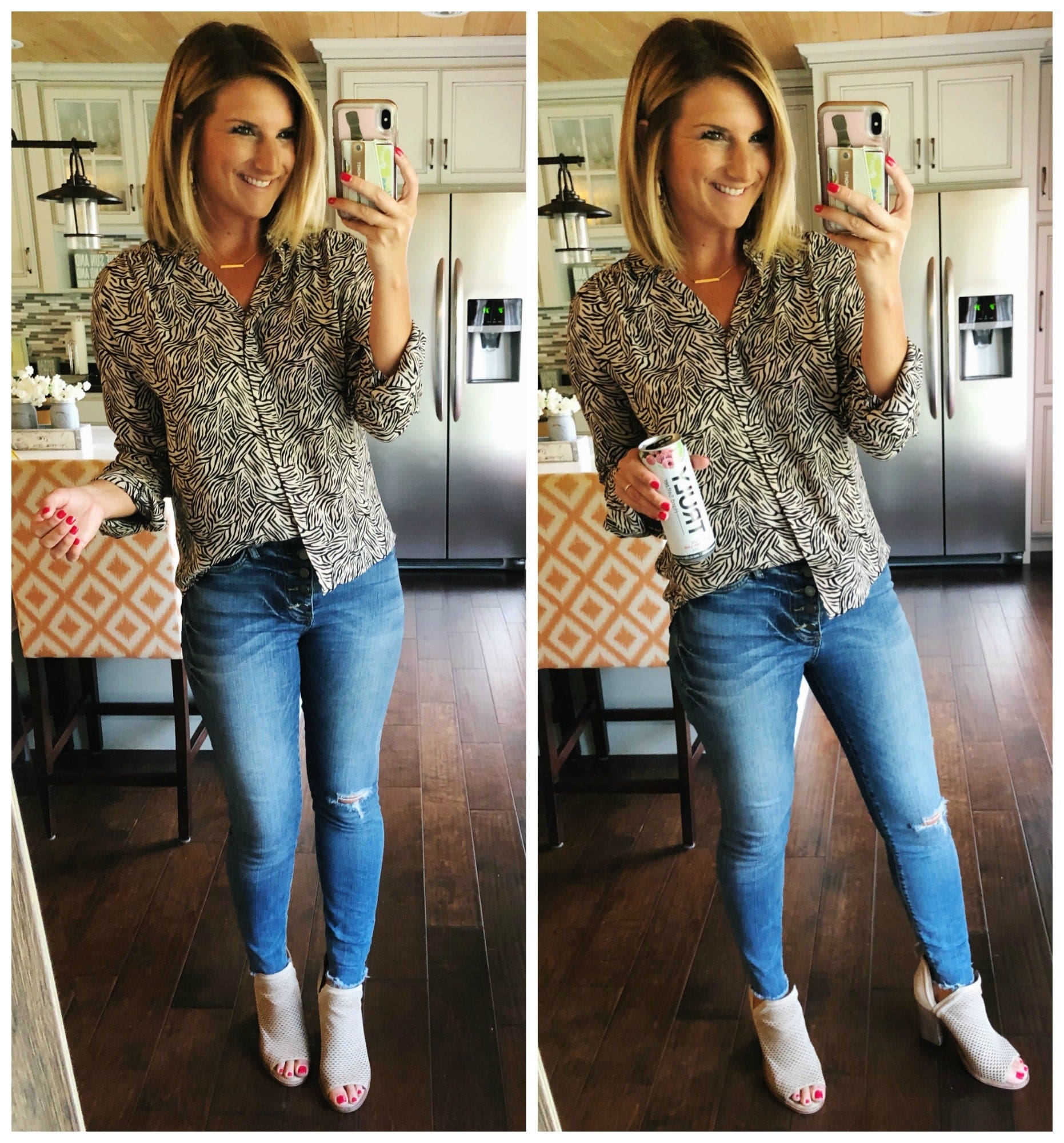 Gibson x City Safari Jaime Shrayber Animal Print Hidden Placket Shirt • Gibson [TTS, wearing in XS] // Connie Ankle Skinny High Rise Raw Hem Jeans • KUT from the Kloth [TTS] // Kensa Peep Toe Bootie [TTS]